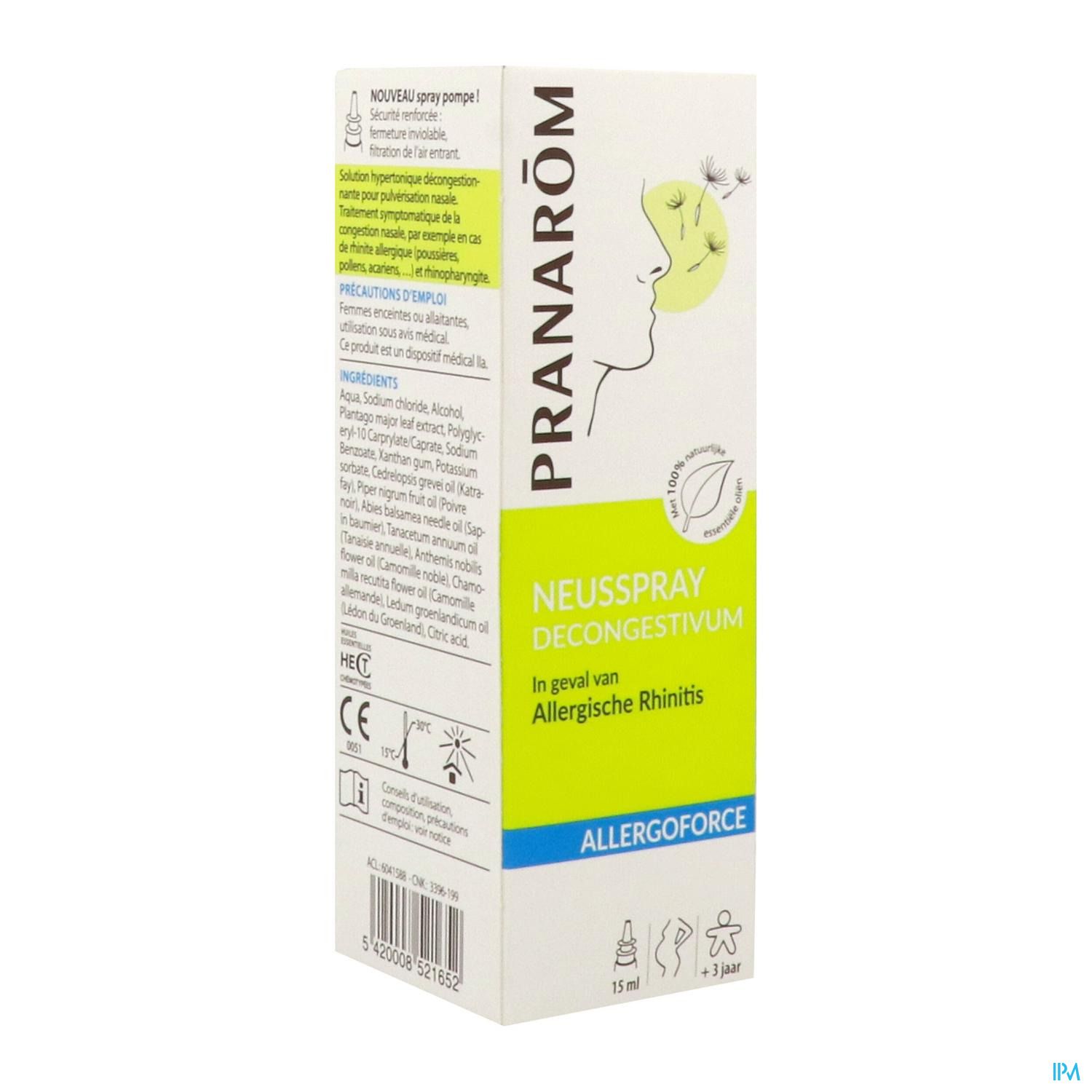 Les huiles essentielles de tanaisie, matricaire , camomille noble et poivre noir sont reconnues pour leurs vertus antiallergiques et anti-in ammatoires. Allergoforce Spray Nasal réduit l'écoulement nasal ou la congestion provoqués par les pollens, les poussières, les acariens,…