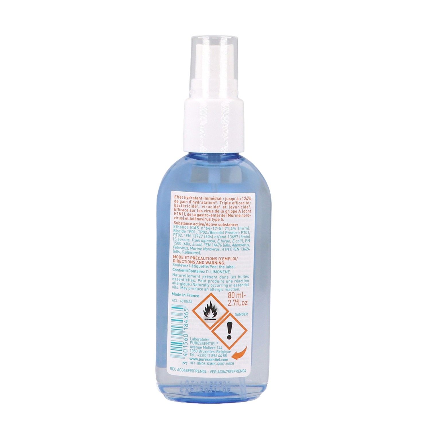 71,4% d'alcool végétal – 3 huiles essentielles (citron, lavandin, tea tree). Aloe Vera anti-desséchant. Ingrédients: Substance active: Ethanol (CAS n°64-17-5) 71,4% (m/m). Biocide TP01. Huiles Essentielles: Citron, Lavandin grosso, Arbre à thé.