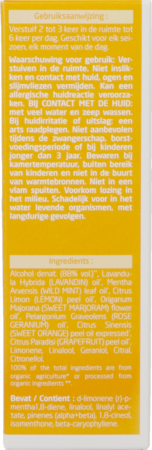 Alcool, huile de lavande, huile de menthe verte, huile de citron, huile de marjolaine vraie, huile de géranium rosat, huile d'orange douce, huile de pamplemousse, limonène, linalol, géraniol, citral, citronellol.