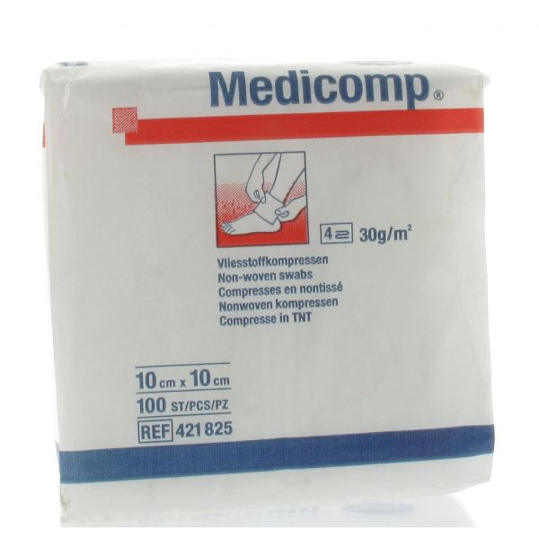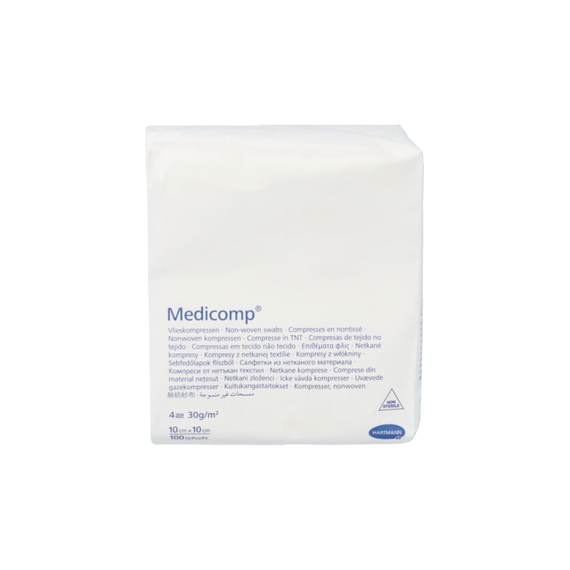 Compresse en non-tissé hydrophile, 70% de viscose et 30% de polyester. Sans produit liant ni correcteurs optiques. Très absorbante, douce et aérée, disponible en plusieurs épaisseurs, non-stériles.