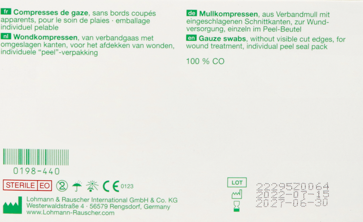 emballées sous blister souple ou rigide, dont le très haut degré de pelabilité évite la dispersion de fibres libres et facilite la manipulation; disponibles en différentes versions selon le nombre de plis et les dimensions, avec ou sans fil radio-opaque
