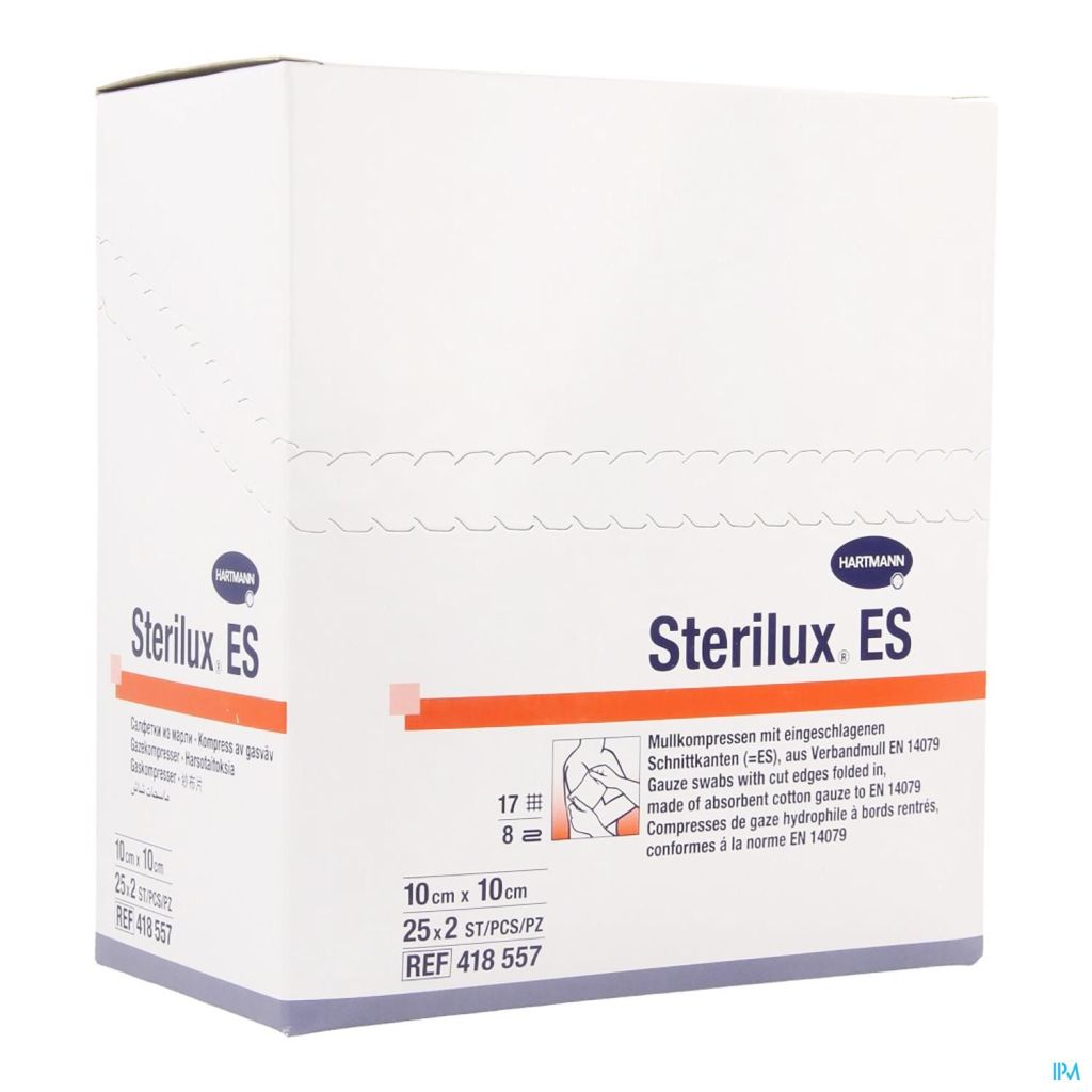 En gaze absorbante conforme à EN 14079, bords rentrés (= ES). Les compresses peuvent être dépliées plusieurs fois sans risque d'effilochage pour être utilisées en formats plus grands; bon pouvoir absorbant, aéré, doux et souple, disponible en plusieurs épaisseurs et densités de fils, stérile.