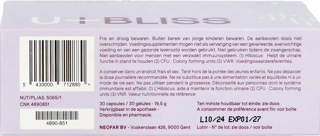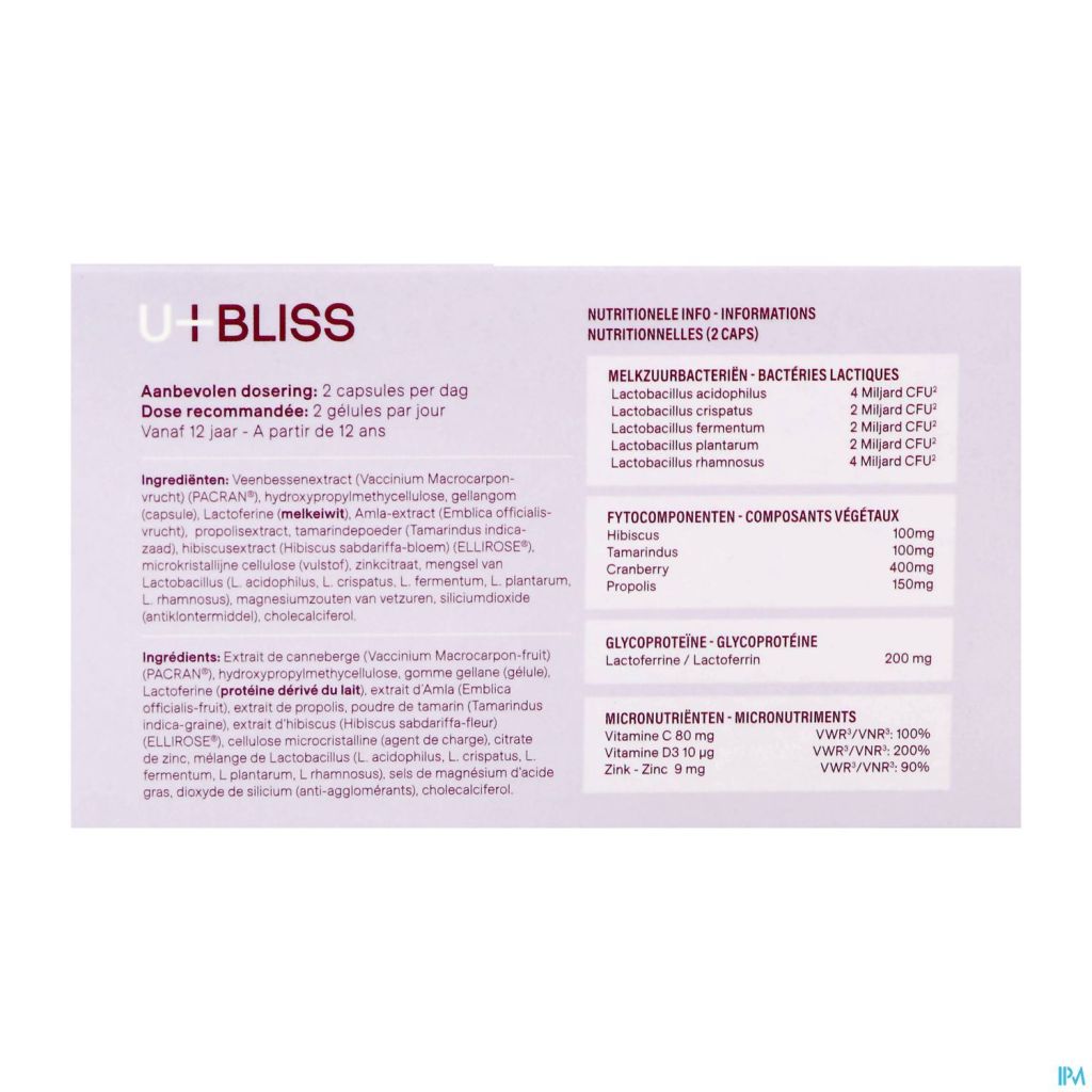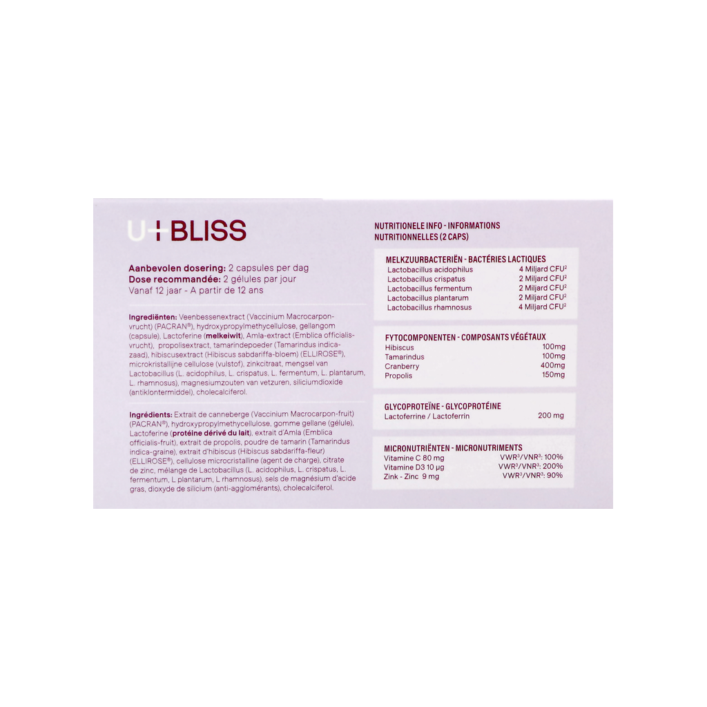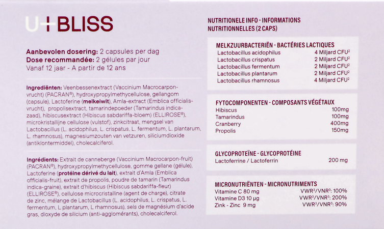 U-bliss contient des phyto-composants de haute qualité, notamment de la canneberge, du tamarin, de l'hibiscus et de la propolis. Dans la mesure du possible, des ingrédients brevetés (PACRAN® et ELLIROSE®) sont utilisés, qui ont prouvé leur utilité dans des études cliniques.