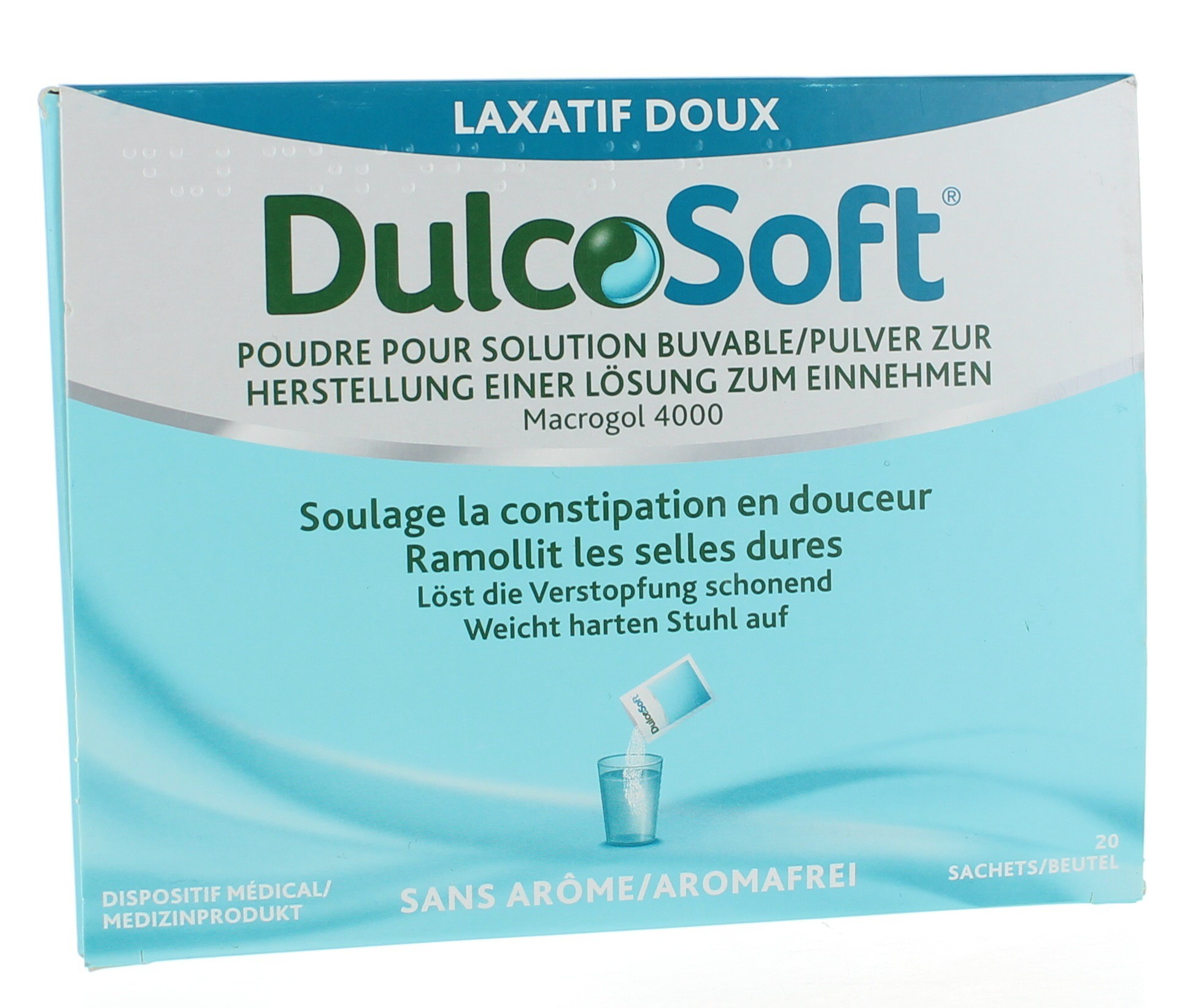 Dulcosoft sachet est un dispositif médical qui se présente sous la forme d'une poudre pour solution buvable. Dulcosoft soulage la constipation en douceur et ramollit les selles dures.