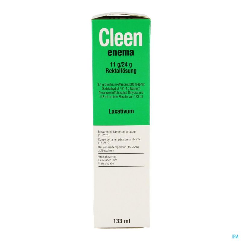 Les substances actives sont : Cleen enema : 1 flacon de 133 ml fournit une dose de 118 ml. Cette dose contient 4,4 g de sodium. Chaque dose de 118 ml contient 21,4 g (18,1 % p/v) de phosphate monobasique de sodium dihydraté et 9,4 g (8,0 % p/v) de phosphate dibasique de sodium dodécahydraté. Cleen enema pediatric : 1 flacon de 66 ml fournit une dose de 59 ml. Cette dose contient 2,2 g de sodium. Chaque dose de 59 ml contient 10,7 g (18,1 % p/v) de phosphate monobasique de sodium dihydraté et 4,7 g (8,0 % p/v) de phosphate dibasique de sodium dodécahydraté.
