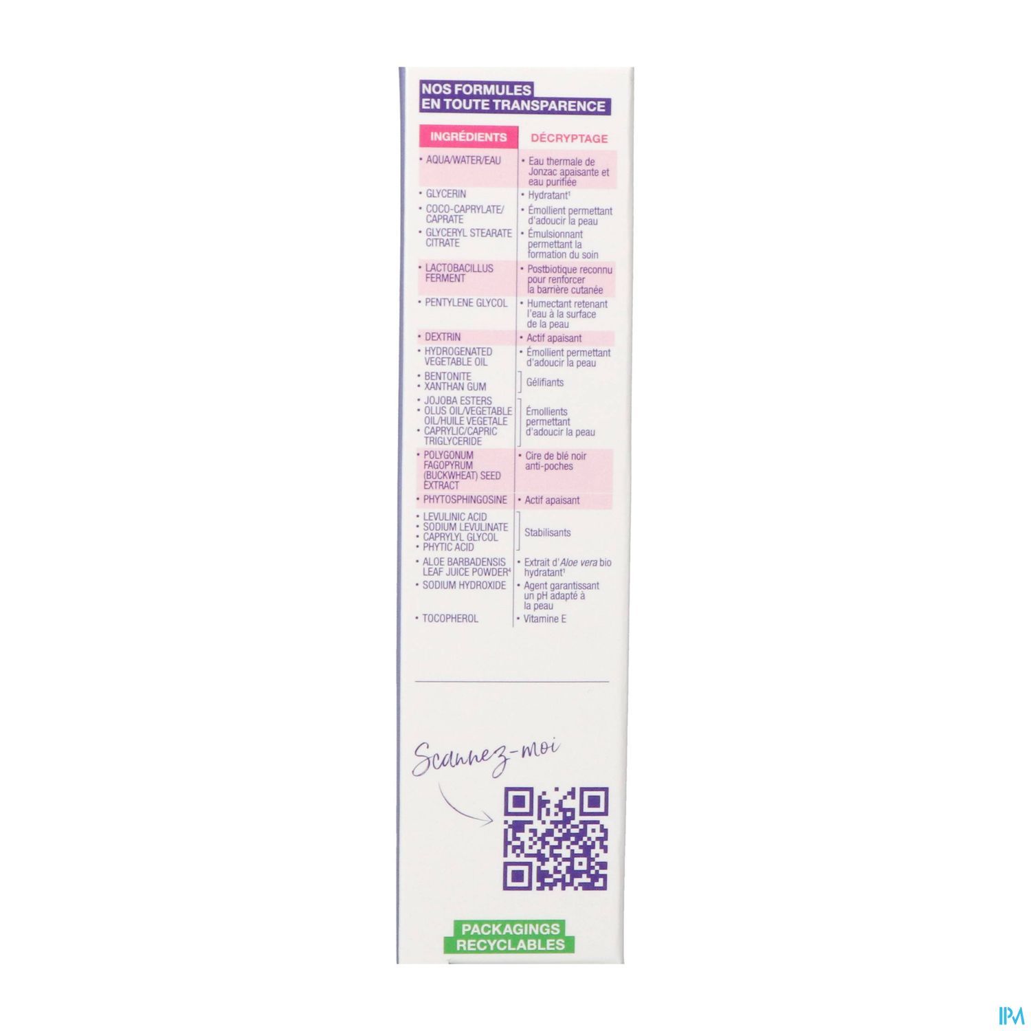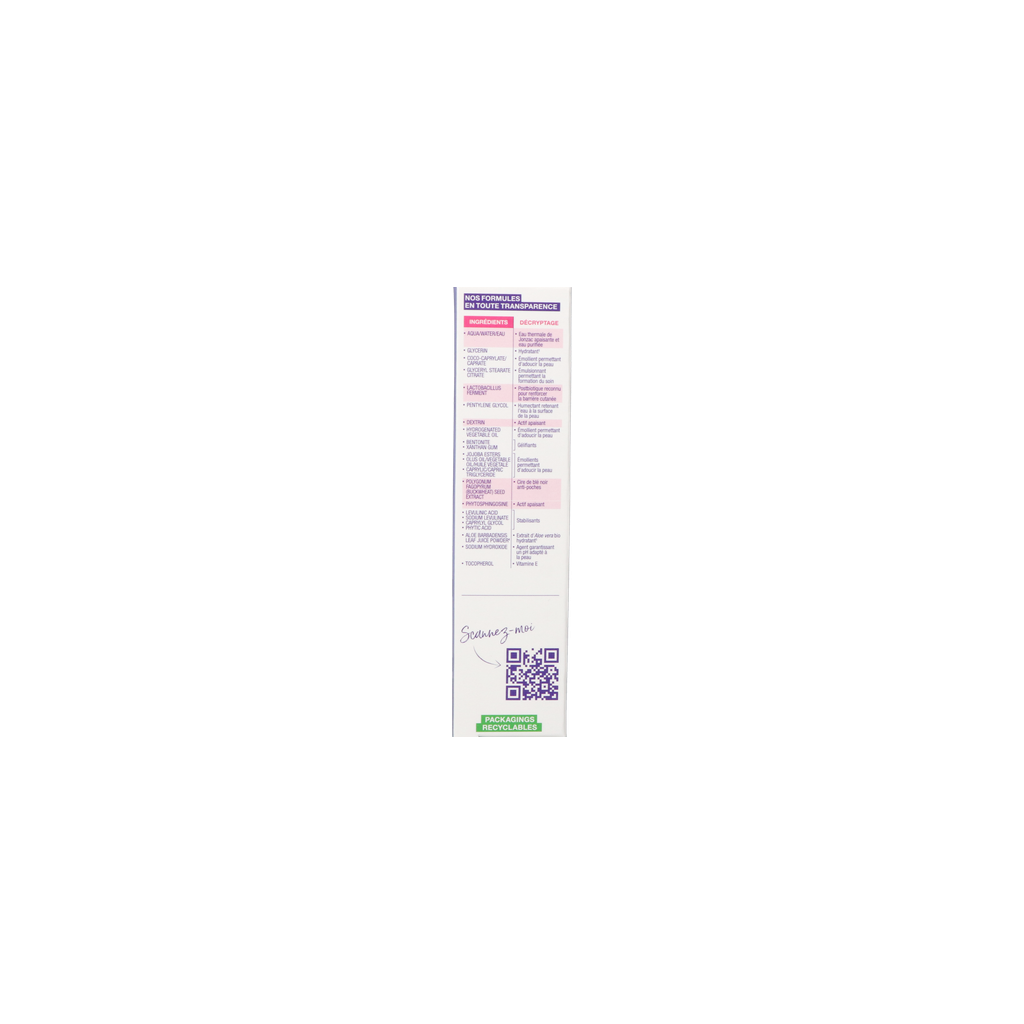 AQUA/EAU, GLYCÉRINE, GLYCERYL STEARATE CITRATE, COCO-CAPRYLATE/CAPRATE, LACTOBACILLUS FERMENT, PENTYLENE GLYCOL, DEXTRINE, HUILE VÉGÉTALE HYDROGÉNÉE, BENTONITE, GOMME XANTHANE, ESTERS DE JOJOBA, HUILE D'OLIVE/HUILE VÉGÉTALE , CAPRYLIC/CAPRIC TRYGLYCERIDE , POLYGONUM FAGOPYRUM (BOOKWHEAT) SAD OIL EXTRACT , PHYTOSPHINGOSINE , LEVULIN ACID , NATRIUM stabilizer LEVULINATE , CAPRYLYL GLYCOL, PHYTIN ACID , ALOË BARBADENSIS LEAF SAP POUDRE , NATRIUMHYDROXIDE , TOCOPHEROL