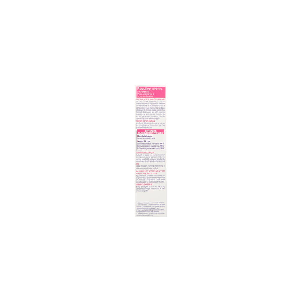 Ce soin ciblé a été formulé spécifiquement pour le contour des yeux intolérant à tendance allergique. Le Contour yeux et paupières apaisant hydrate¹ et calme immédiatement les sensations d'irritations, de tiraillements et de démangeaisons. Sa formule unique associe l'eau thermale de Jonzac à des actifs reconnus apaisants et anti-poches.