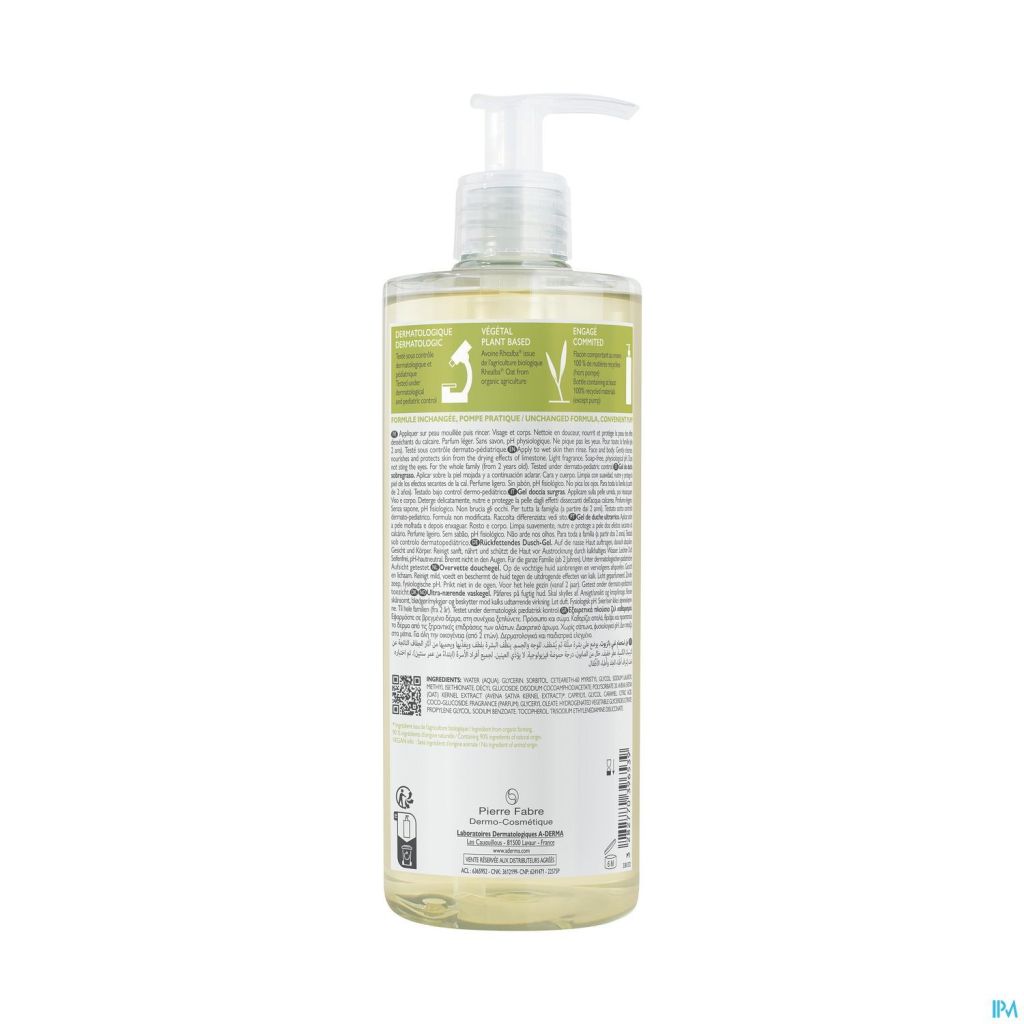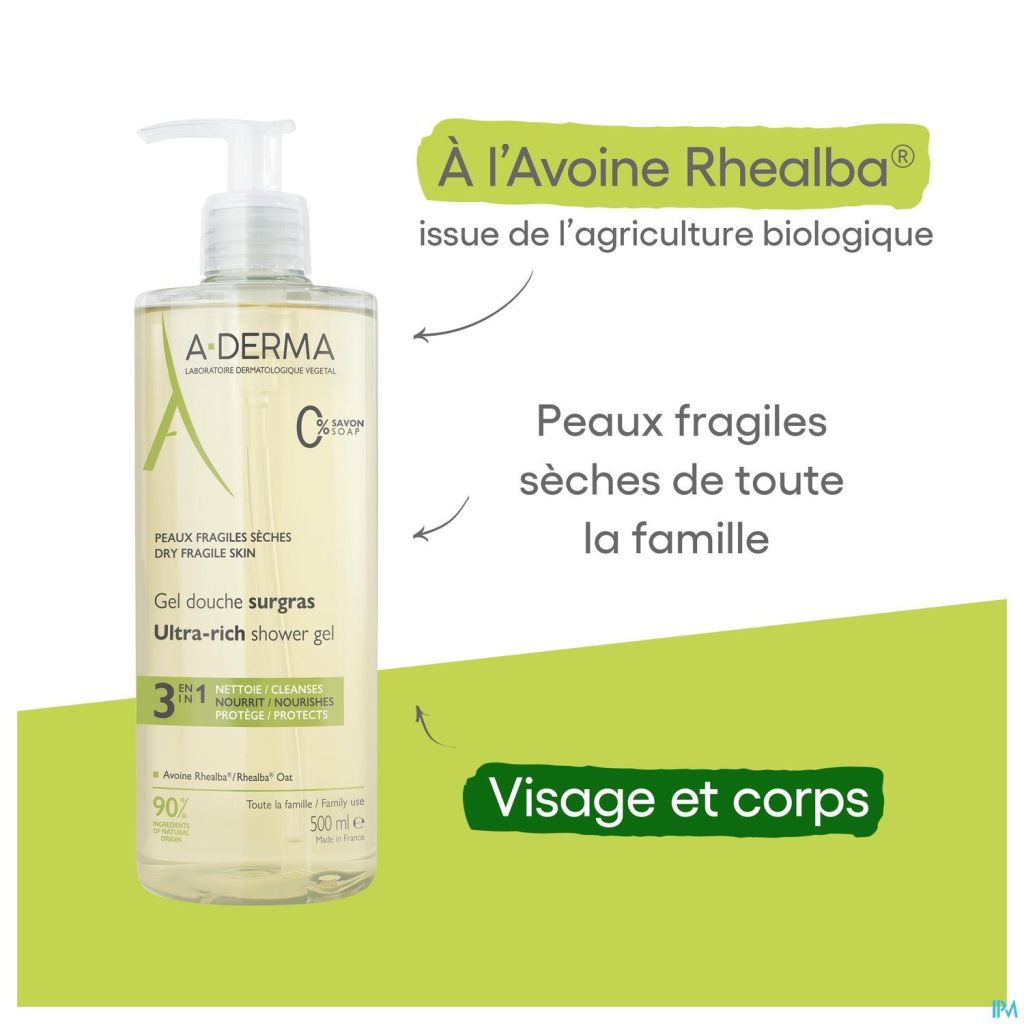 Expert de l'hygiène des peaux fragiles, le Laboratoire dermatologique végétal A-DERMA répond au besoin des peaux sèches avec ce gel douche. Ce soin lavant composé à 90 % d'ingrédients d'origine naturelle nettoie en douceur, nourrit et protège. Enrichi en émollients d'origine naturelle, il tire son efficacité et ses vertus apaisantes et relipidantes de l'innovation Clean Care Complex™. Cette association comprend une base lavante douce et un agent compensateur, pour nettoyer sans agresser ni dessécher. Sa formule fondante, à l'extrait de Plantules d'Avoine Rhealba® apaisante adoucit la peau. Biodégradable*, sans savon, le Gel douche surgras est adapté à toute la famille et s'applique sur le visage et le corps. Sous la douche, il se transforme en une mousse aérienne, au parfum léger, qui se rince facilement. La peau sèche est nourrie, apaisée et protégée Avoine Rhealba® issue de l'agriculture biologique. Info Vegan : sans ingrédient d'origine animale.