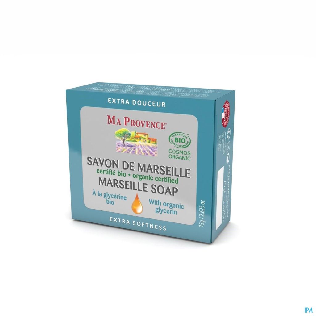 Savon de Marseille bio glycérine 75 g100 % des ingrédients d'origine naturelle 79 % d'ingrédients issus de l'Agriculture Biologique base huiles végétales certifiées format 80 g sous étui carton