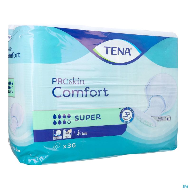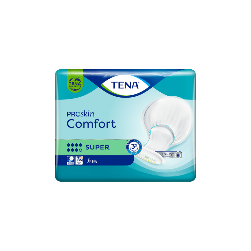 TENA Comfort Super est une protection absorbante de forme anatomique confortable pour les personnes nécessitant un produit d'incontinence possédant une haute capacité d'absorption et souhaitant continuer à utiliser des serviettes. Forme anatomique unique, pour une sécurité anti-fuites optimale et un ajustement près du corps. Grâce à FeelDry Advanced™, le produit absorbe instantanément le liquide, aidant à maintenir la peau sèche et saine. Le cœur absorbant absorbe alors rapidement l'urine, même en grande quantité, pour garder la peau sèche, et le voile extérieur ConfioAir™ 100 % respirant laisse la peau respirer. Toutes ces caractéristiques aident à préserver la santé naturelle de la peau. Cette protection absorbante fiable est maintenue en place par le sous-vêtement de fixation réutilisable TENA Fix. La protection TENA ProSkin Comfort peut être enfilée debout ou allongé et est facile à mettre en place et à changer. Les protections TENA ProSkin Comfort sont disponibles en différents niveaux d'absorption.