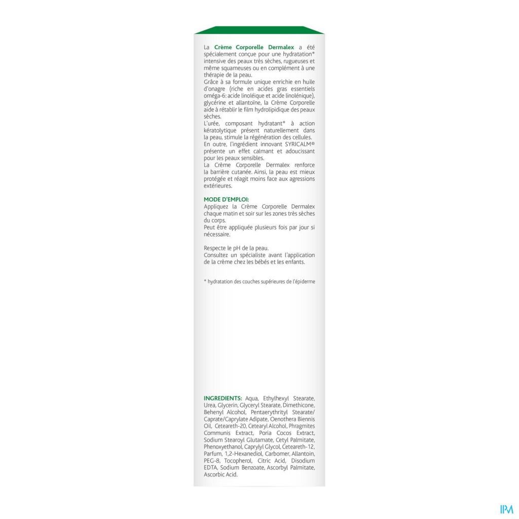 Appliquer la Crème corporelle Dermalex deux fois par jour sur l'ensemble du corps.
