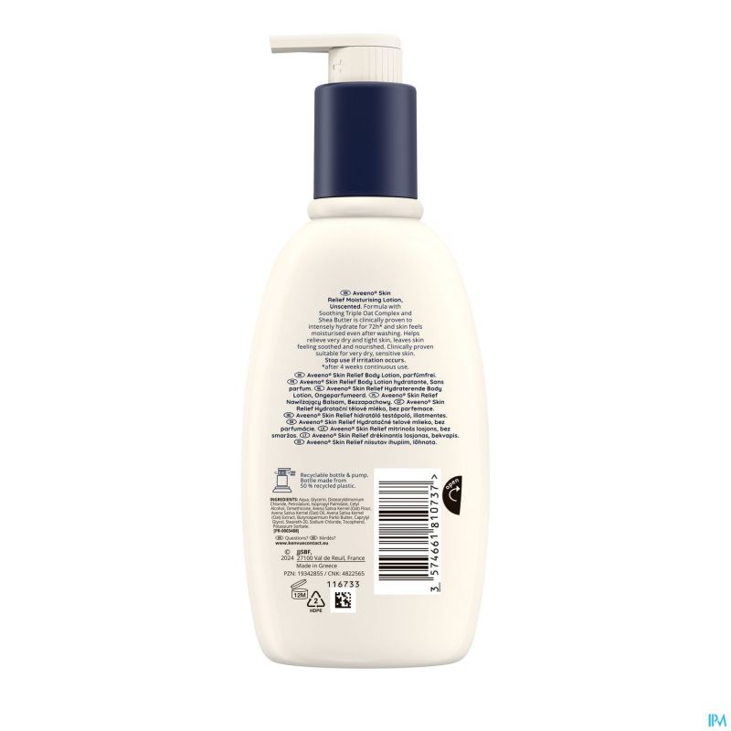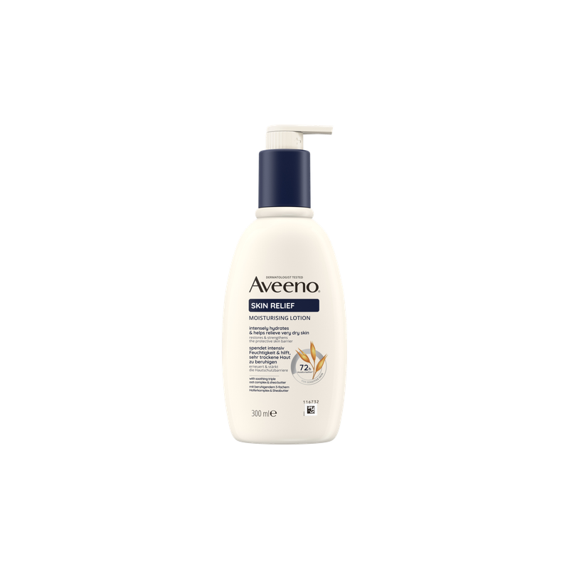 La lotion corporelle hydratante Aveeno® Skin Relief est cliniquement prouvée pour hydrater intensément la peau pendant 72 heures* et aider à soulager les symptômes d'une peau très sèche et qui tiraille. Sa formule au triple complexe d'avoine apaisant (extrait d'avoine, farine d'avoine colloïdale et huile d'avoine) et au beurre de karité renforce la barrière cutanée naturelle et protège la peau des agressions extérieures. Elle favorise également la production naturelle de céramides par la peau. La formule non parfumée, hypoallergénique** et végétalienne° est cliniquement prouvée pour convenir aux peaux très sèches et sensibles. Elle n'est pas grasse et pénètre rapidement.