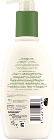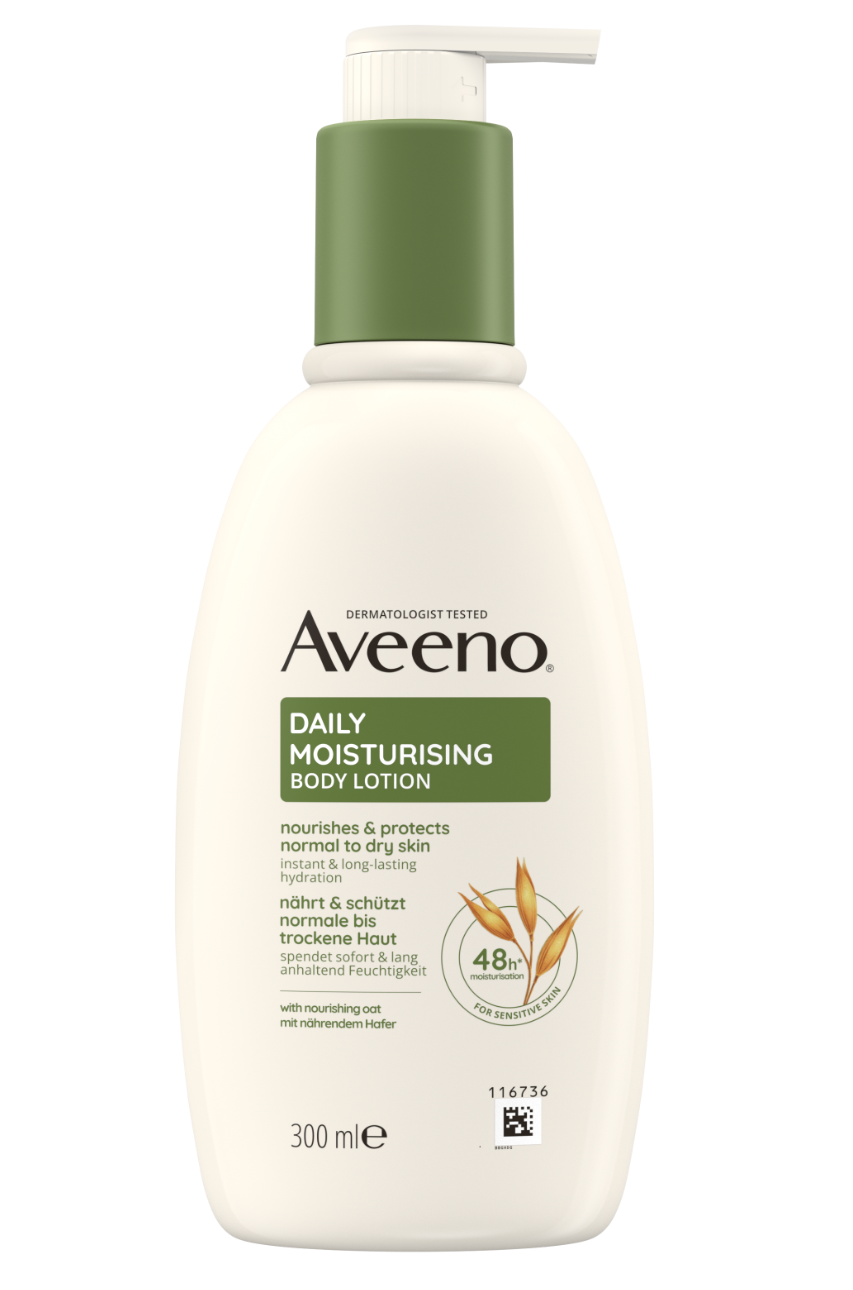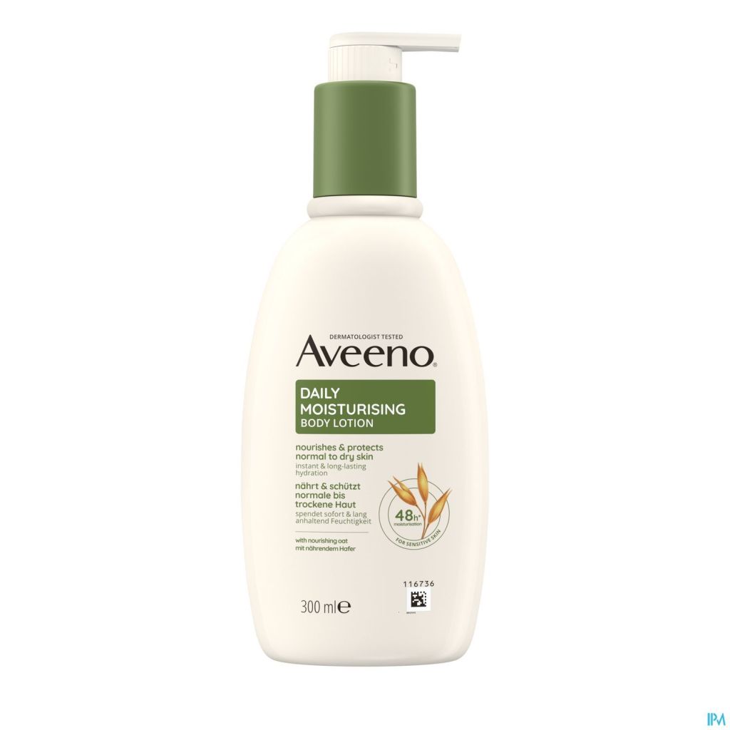La lotion corporelle hydratante quotidienne Aveeno® contient de l'avoine nourrissante et de riches émollients qui aident à renforcer la barrière naturelle de la peau et à la protéger des influences extérieures et de la perte d'hydratation. Cette lotion non grasse et à absorption rapide apaise la peau, tout en nourrissant la peau sèche et en aidant à prévenir le dessèchement. La lotion pour le corps convient aux peaux normales à sèches et sa formule a été développée pour les peaux sensibles. La lotion hydratante quotidienne Aveeno® hydrate la peau pendant 48 heures*.