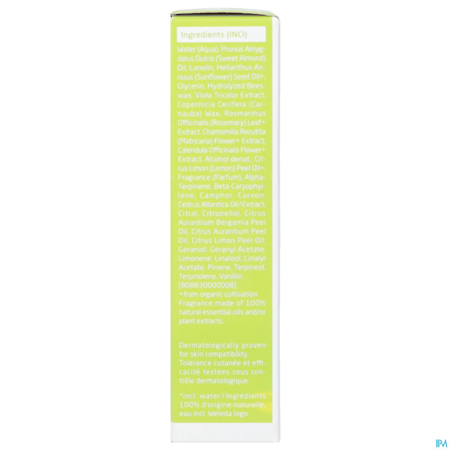 Water (Aqua), Prunus Amygdalus Dulcis (Sweet Almond) Oil, Lanolin, Glycerin, Hydrolyzed Beeswax, Viola Tricolor Extract, Copernicia Cerifera (Carnauba) Wax, Rosmarinus Officinalis (Rosemary) Leaf Extract, Chamomilla Recutita (Matricaria) Flower Extract, Citrus Limon (Lemon) Peel Oil, Fragrance (Parfum) 1, Limonene 1, Linalool 1, Citronellol 1, Geraniol 1, Citral 1