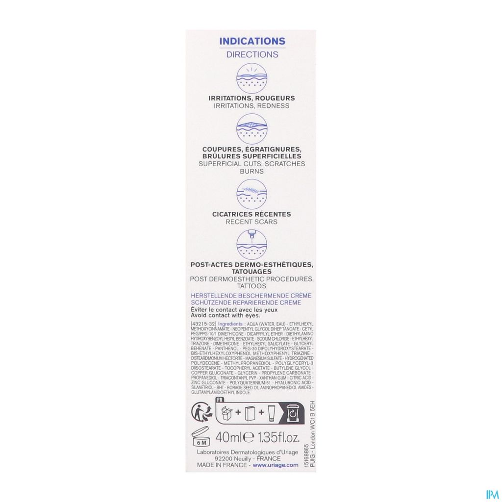 Principes actifs Eau thermale d'Uriage actifsAction GF-Repair identifiéeSmectite + complexe Poly-2P brevetéOxyde de zincGluconate de cuivre D-PanthénolAcide hyaluronique Silicium organique Hypoallergénique Sans parfum Sans conservateurs