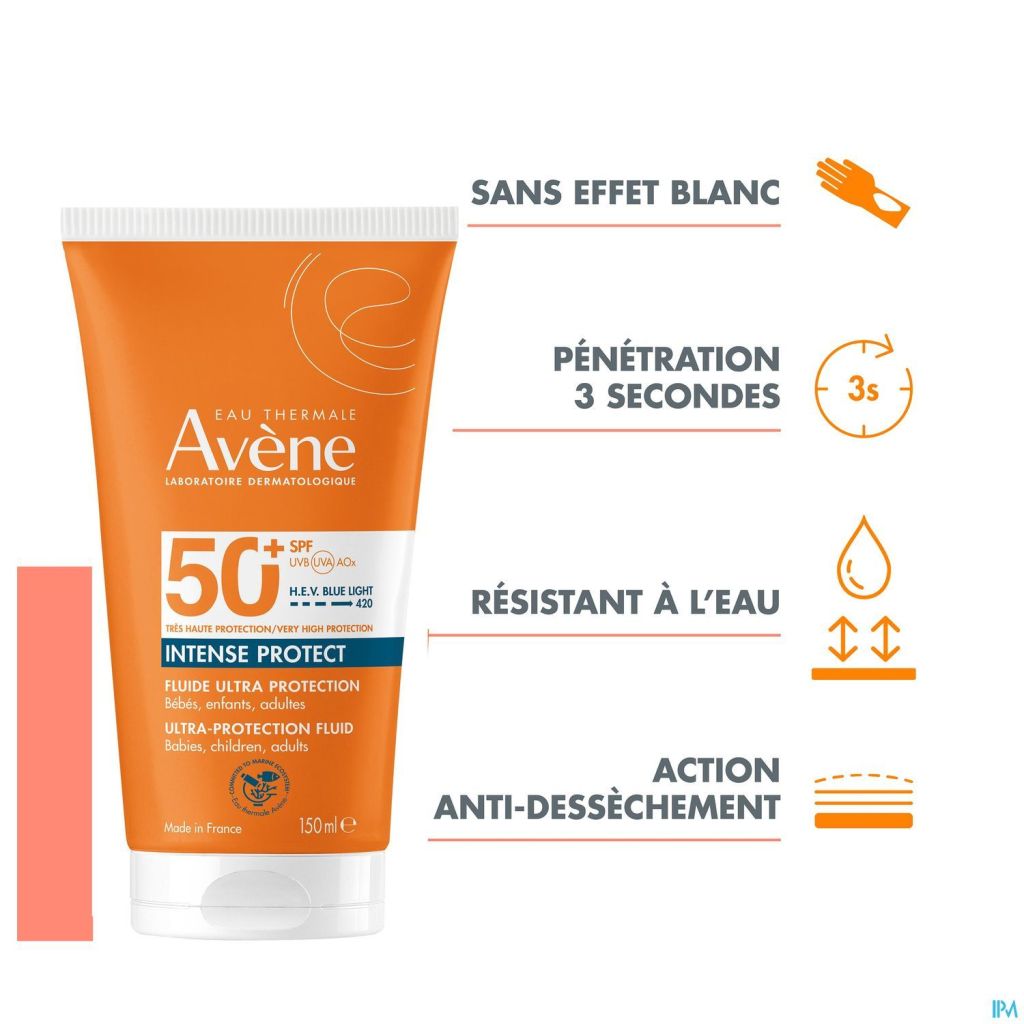 Intense Protect 50+ est un soin solaire ultra large spectre. Pour la première fois, une photoprotection est étendue au-delà des UVB UVA à une autre partie du rayonnement solaire : la lumière bleue haute énergie visible. Un soin solaire adapté aux conditions d'ensoleillement les plus intenses, ainsi qu'aux peaux les plus vulnérables. Sa texture hybride permet une pénétration en 3 secondes**, une hydratation intense durant 8 h*** et une action anti-dessèchement. Il est ultra-résistant à l'eau et résistant à la sueur. Intense Protect 50+ convient aux bébés à partir de 6 mois, aux enfants, aux femmes enceintes comme aux patients en post-actes chirurgicaux et tatouages post réépidermisation. Avec quatre filtres seulement, une concentration en filtres solaires réduite**** et dépourvue de silicone, sa formule est respectueuse de l'environnement.