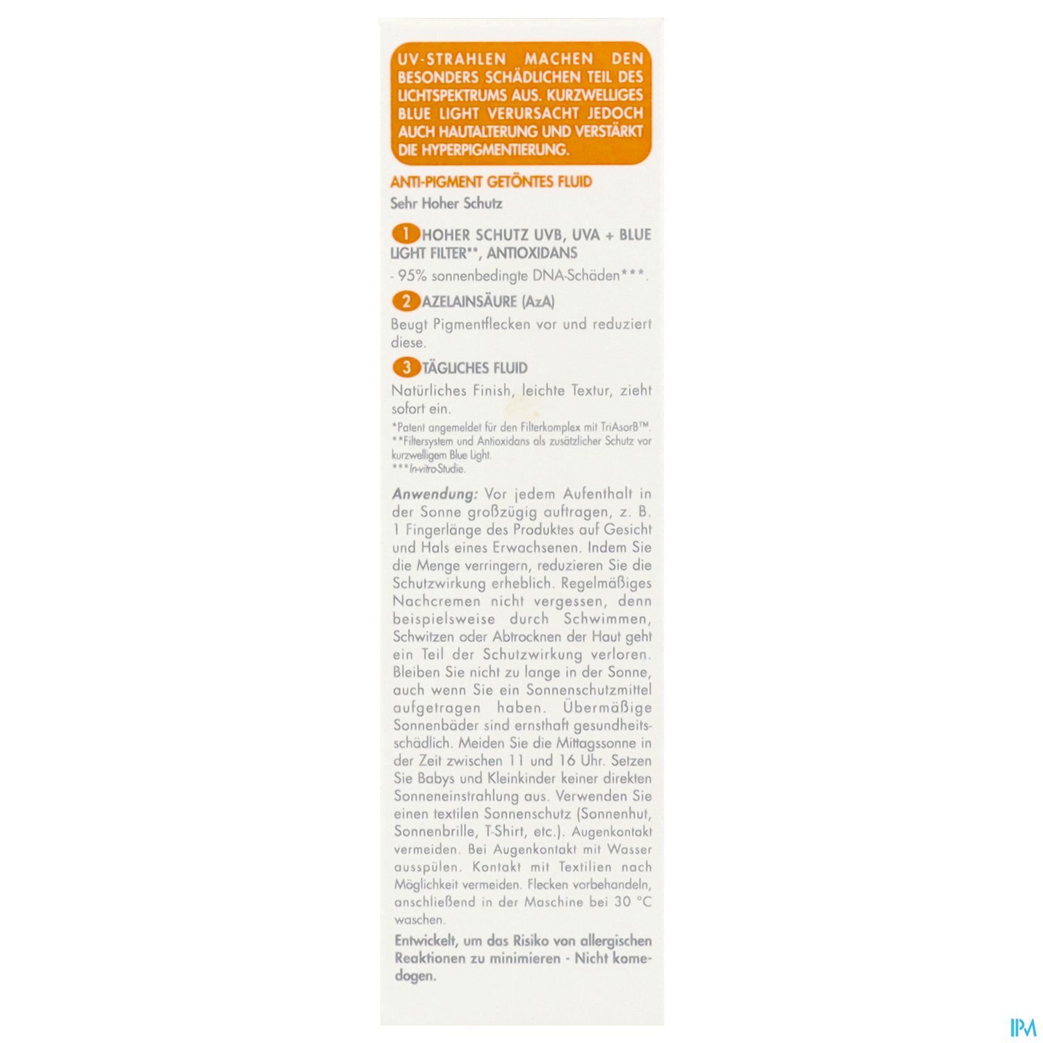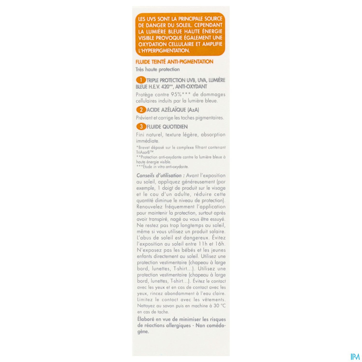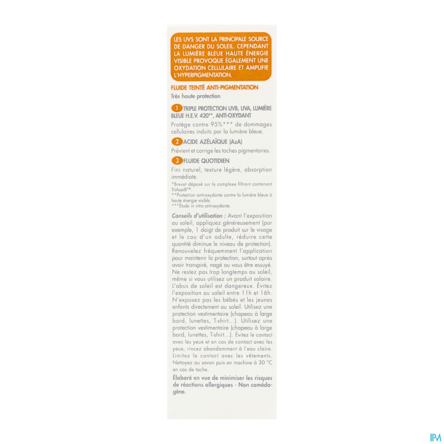 Le fluide Anti-pigmentation SPF50+ offre une très haute protection quotidienne contre les UVB, les UVA et la lumière bleue HEV pour prévenir les taches pigmentaires photo induites