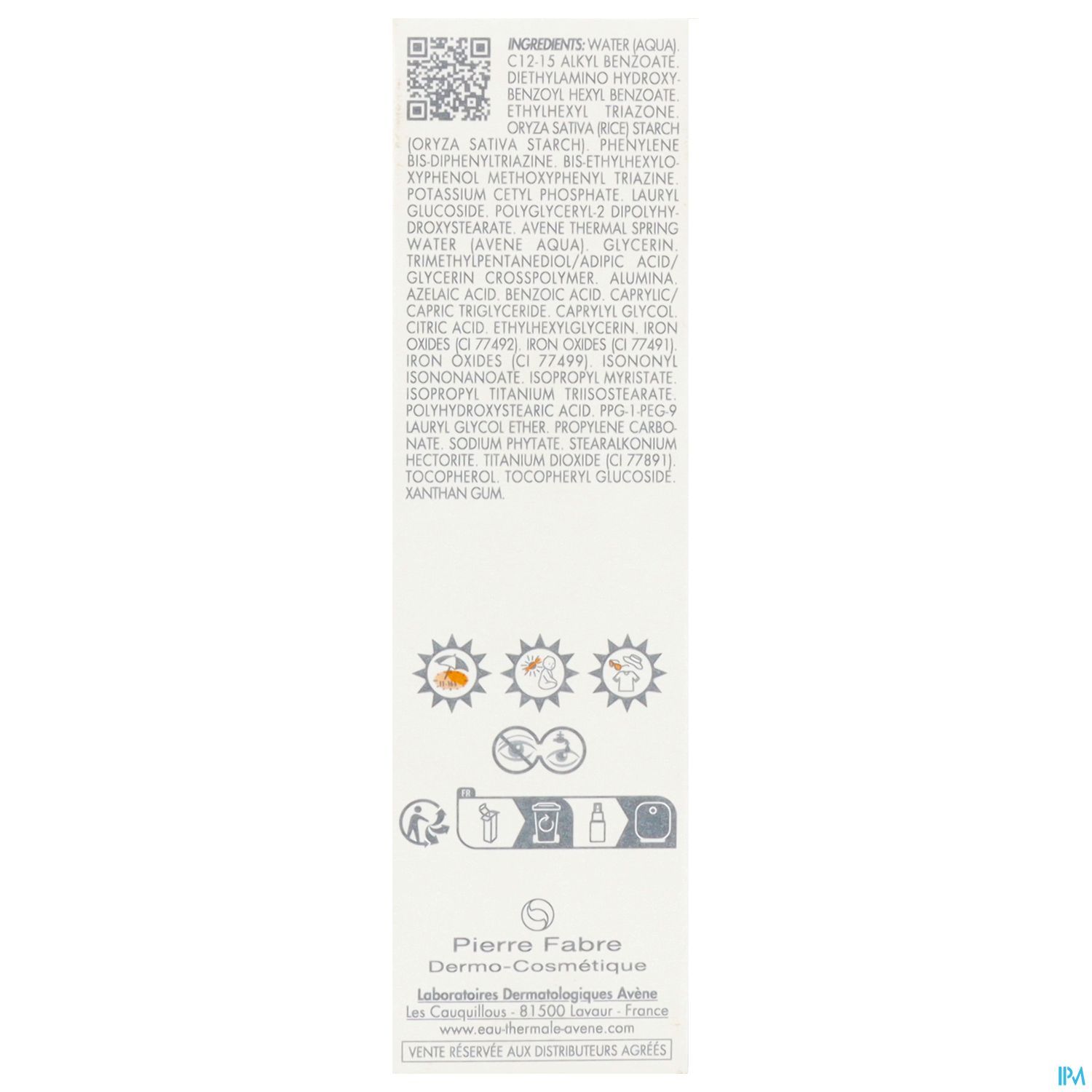 WATER (AQUA). C12-15 ALKYL BENZOATE. DIETHYLAMINO HYDROXYBENZOYL HEXYL BENZOATE. ETHYLHEXYL TRIAZONE. ORYZA SATIVA (RICE) STARCH (ORYZA SATIVA STARCH). PHENYLENE BIS-DIPHENYLTRIAZINE. BIS-ETHYLHEXYLOXYPHENOL METHOXYPHENYL TRIAZINE. POTASSIUM CETYL PHOSPHATE. LAURYL GLUCOSIDE. POLYGLYCERYL-2 DIPOLYHYDROXYSTEARATE. AVENE THERMAL SPRING WATER (AVENE AQUA). GLYCERIN. TRIMETHYLPENTANEDIOL/ADIPIC ACID/GLYCERIN CROSSPOLYMER. ALUMINA. AZELAIC ACID. BENZOIC ACID. CAPRYLIC/CAPRIC TRIGLYCERIDE. CAPRYLYL GLYCOL. CITRIC ACID. ETHYLHEXYLGLYCERIN. IRON OXIDES (CI 77492,CI 77491,CI 77499). ISONONYL ISONONANOATE. ISOPROPYL MYRISTATE. ISOPROPYL TITANIUM TRIISOSTEARATE. POLYHYDROXYSTEARIC ACID. PPG-1-PEG-9 LAURYL GLYCOL ETHER. PROPYLENE CARBONATE. SODIUM PHYTATE. STEARALKONIUM HECTORITE. TITANIUM DIOXIDE (CI 77891). TOCOPHEROL. TOCOPHERYL GLUCOSIDE. XANTHAN GUM