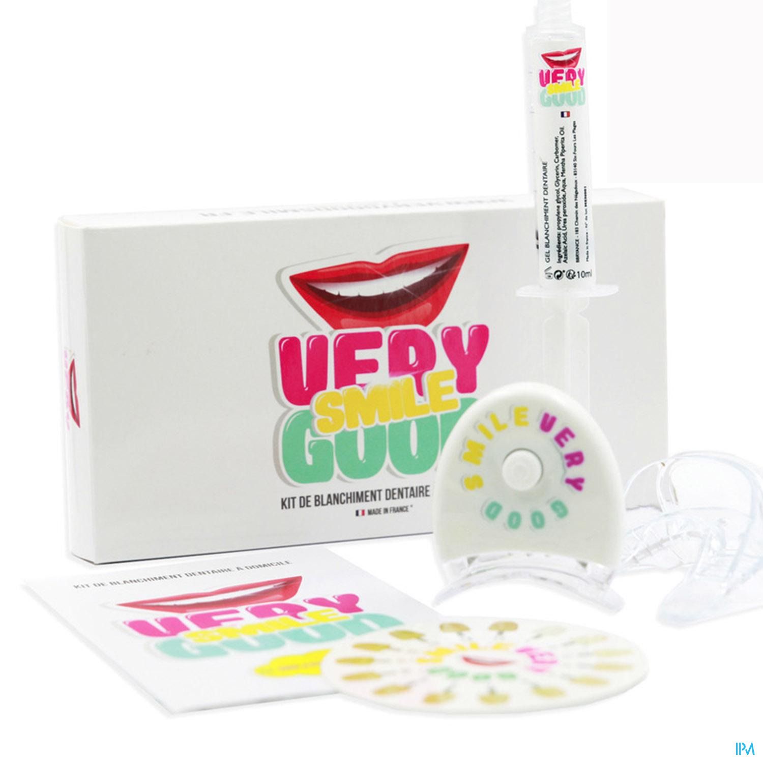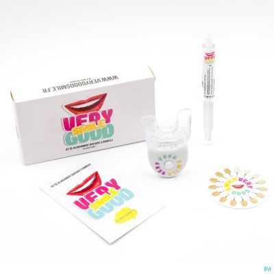 Le kit contient :1 Gel de 10 ML fabriqué en France 1 Lampe LED 1 Gouttière Universelle 1 Mode d'emploi en Français / Anglais ou Français / Neerlandais 1 Guide de teinte Le kit dentaire VERY GOOD SMILE permet environ 7 À 10 utilisations selon les dosages !