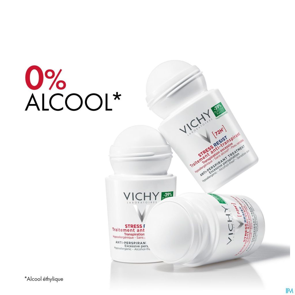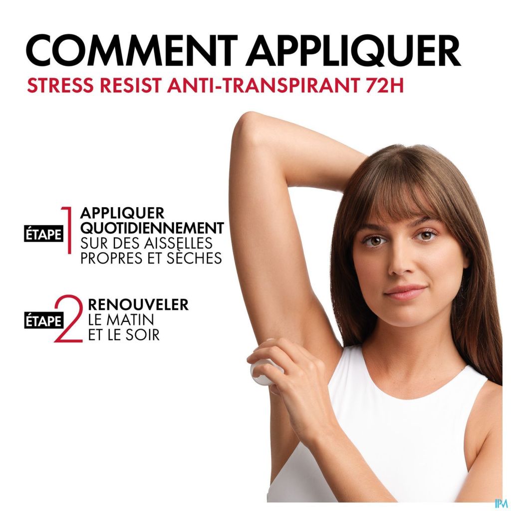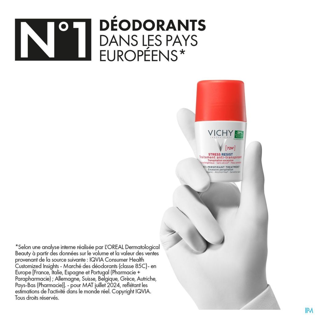 Le Détranspirant Intensif Stress Resist 72h de Vichy est un déodorant roll-on efficace qui régule la chaleur et les odeurs, même en situation de stress. Sa formule hypoallergénique, à la tolérance optimale, a été testée sous contrôle dermatologique et ne contient pas d'alcool*, une composition idéale pour les peaux sensibles. Le format roll-on avec un applicateur optimisé permet un meilleur contact avec la peau. Bénéficiez d'une protection intense contre la transpiration et les mauvaises odeurs jusqu'à 72 heures avec Vichy Détranspirant Intensif Stress Resist 72h. Vichy Détranspirant Intensif Stress Resist 72h est un traitement anti-transpirant qui aide à réguler la transpiration excessive, même lors de périodes de stress. La texture non grasse et non collante protège efficacement contre la transpiration et réduit les sensations d'inconfort, même en période de stress. Appliquez quotidiennement pour une protection idéale, grâce à laquelle vous vous sentirez en sécurité tout au long de la journée.