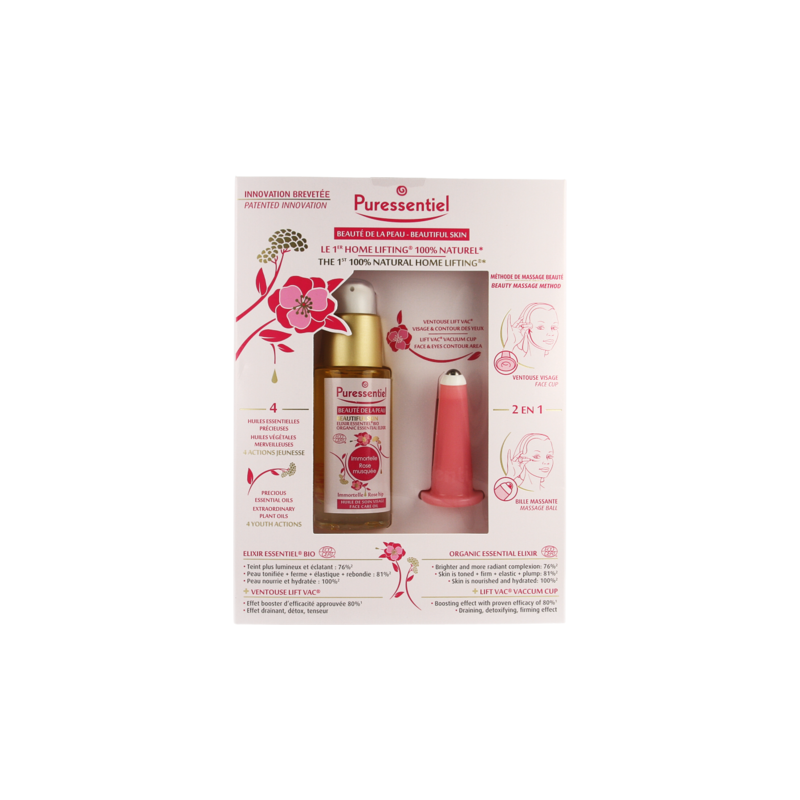 Ce programme "Home Lifting® 100% naturel" associe l'efficacité de l'Elixir Essentiel® BIO, aux résultats démontrés sous contrôle d'un médecin dermatologue, à l'efficacité de la ventouse LIFT VAC® Puressentiel, reproduisant la méthode de massage beauté de kiné faciale aux effets raffermissants et remodelants reconnus. L'Elixir Essentiel® BIO associe 8 actifs soigneusement sélectionnés et dosés pour agir en synergie sur les principaux signes visibles de jeunesse du visage, du cou et du décolleté. Le confort de la peau est immédiat, la peau paraît redensifiée, repulpée, revitalisée, régénérée elle est plus belle, le grain de peau est affiné. Grâce à son effet lissant et remodelant, la profondeur des rides et ridules est comme atténuée, l'apparence des cernes est réduite de façon importante. Sa texture "huile fluide" convient à tous les types de peaux même sensibles et n'obstrue pas les pores de la peau. Testée sous contrôle dermatologique, sa tolérance cutanée a été jugée optimale. ELIXIR ESSENTIEL BIO : >Teint plus lumineux et éclatant : 76%* 2 >Peau tonifiée, plus ferme, plus élastique et plus rebondie : 81%* 2 > Peau nourrie et hydratée : 100%* 2 + VENTOUSE LIFT VAC : >Effet booster d'efficacité approuvée : 80%**1 >Effet drainant, détox et tenseur * 2 % de satisfaction - Test d'usage sous contrôle dermatologique - 21 personnes - utilisation biquotidienne pendant 28 jours **1 % de satisfaction - Test d'usage sous contrôle dermatologique - 20 personnes - utilisation biquotidienne pendant 28 jours de l'huile de soin visage et de la ventouse.