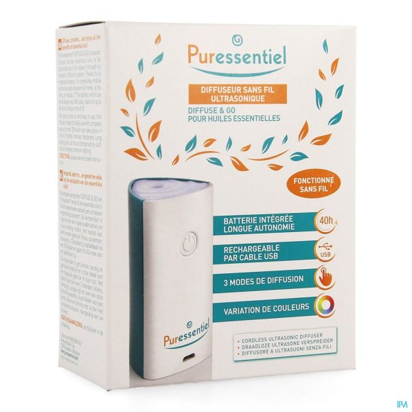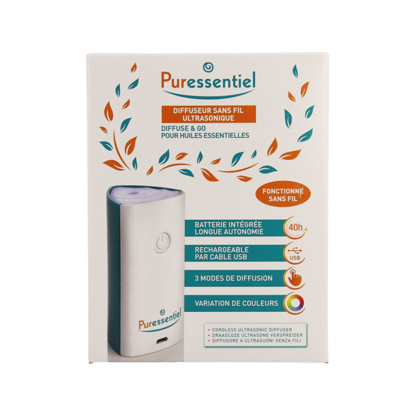 Le diffuseur ultrasonique DIFFUSE & GO Puressentiel® permet la diffusion d'huiles essentielles par petites pulvérisations grâce à son système de diffusion à ultrasons. Totalement nomade avec sa batterie intégrée il peut être utilisé partout (maison, bureau, vacances...) ! La batterie, rechargeable par câble USB, a une autonomie allant jusqu'à 40h pour un temps de charge de 3h.