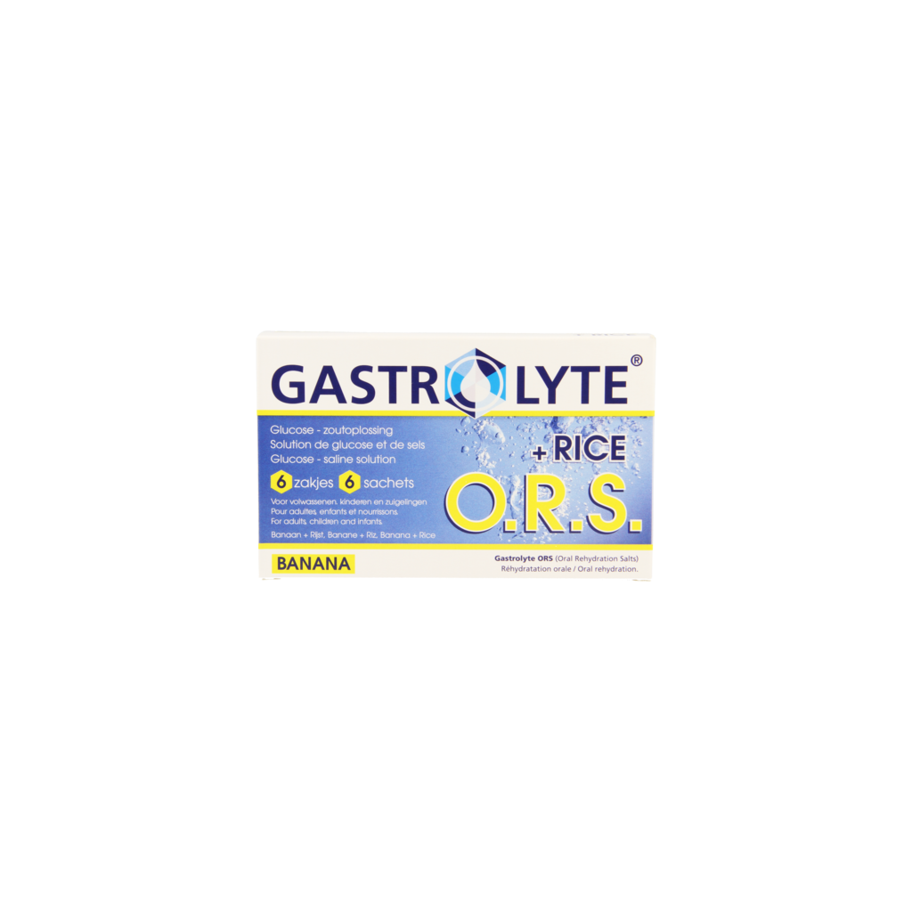 Gastrolyte O.R.S. Banana + rice est une préparation instanée avec un goût de banane agréable, possédant les propriétés de l'eau de riz. C'est un O.R.S. (= Oral Rehydration Salts), afin de soutenir un bon équilibre des fluides.