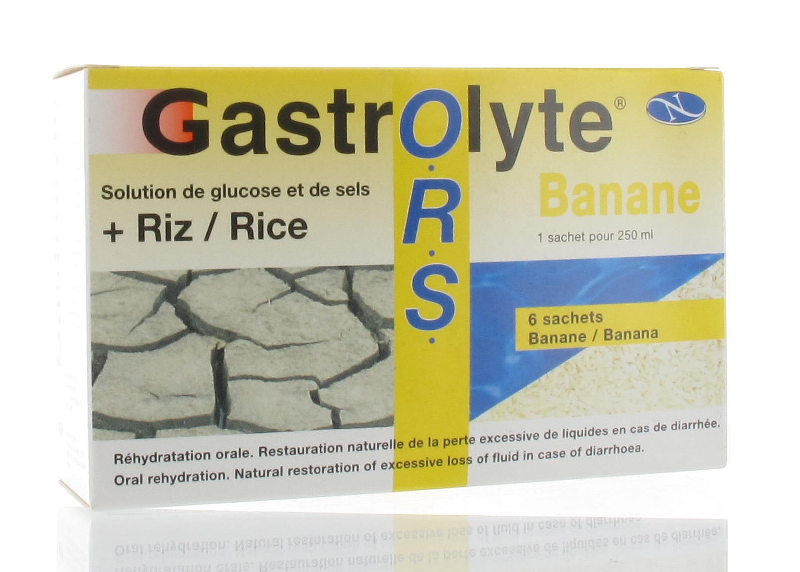 Gastrolyte ORS Banane des laboratoires Novum Pharma est une solution de glucose et de sels + riz pour une réhydratation orale.