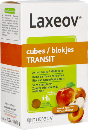 Paresse intestinale ? Transit difficile ? Cela peut provenir d'une consommation insuffisante de fibres, d'un manque d'hydratation, d'une faiblesse d'activité physique ou encore de facteurs externes (voyages, stress…). Innovation des Laboratoires Nutreov, inspirée par la nature, la formule exclusive de Laxeov® Cubes Transit Pomme-Abricot associe différentes sources de fibres sélectionnées pour leur rôle dans le confort intestinal : son de blé, fibres de pomme, fibres d'avoine et fructo-oligosaccharides.