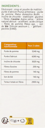 Edulcorant : sirop et poudre de maltitol – Purée d'abricot Prunus armeniaca (31,3%) – Purée de pomme Malus domestica Borkh. (26,2%) – Inuline de chicorée (15,1 %) – Stabilisant : glycérol – Fibres d'avoine Avena sativa L. (1%) – Arôme naturel abricot – Acidifiant : acide citrique – Fibres de pomme Malus spp. (0,7%) – Son de blé Triticum aestivum L. (0,7%) – Gélifiant : pectine.