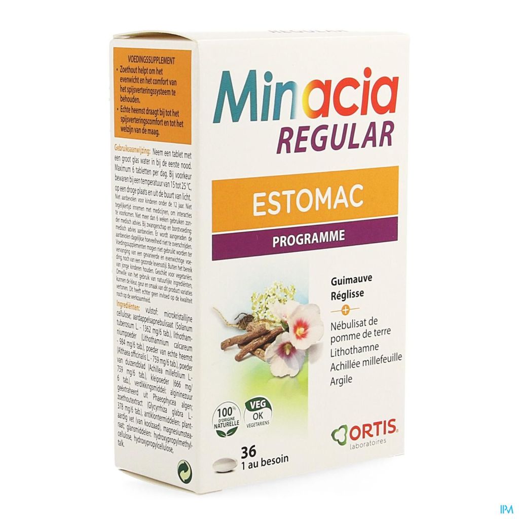 agent de charge: cellulose microcristalline; nébulisat de jus de pomme de terre (Solanum tuberosum L. - 1362 mg/6 comp.), poudre de lithothamne (Lithothamnium calcareum - 984 mg/6 comp.), poudre de guimauve (Althaea officinalis L. - 759 mg/6 comp.), poudre d'achillée millefeuille (Achillea millefolium L. - 759 mg/6 comp.), poudre d' argile (666 mg/6 comp.), épaississant: acide alginique extrait d'algues Phaeophycea; extrait de réglisse (Glycyrrhiza glabra L. - 378 mg/ 6 comp.), anti-agglomérants: graisse végétale (issue du colza), stéarate de magnésium; agents d'enrobage: hydroxypropylméthylcellulose, hydroxypropylcellulose, talc.