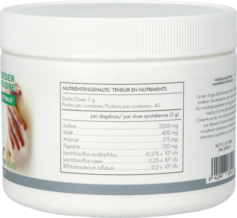 Inuline, fructose, malt, poudre d'ananas (broméline), papaye (papaïne), lactobacillus acidophylus, lactobacillus caseï, bifidobacterium bifidum, acide lactique, acide citrique (régulateur d'acidité), gomme xanthane, gomme guar.