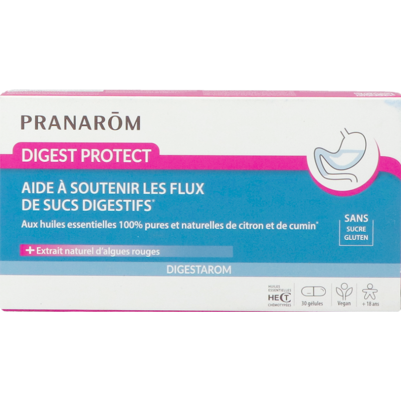 DIGEST PROTECT est un complément alimentaire destiné à agir sur le flux des sucs digestifs. L'action complémentaire de la racine de guimauve, de la poudre de lithothamne et des huiles essentielles permet de réduire les inconforts gastriques en fin de repas, sans effets secondaires.