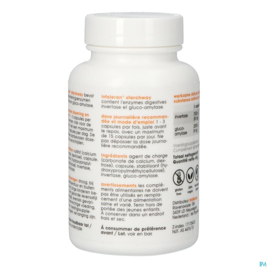 Starchway contient les enzymes Invertase et Gluco-Amylase. Il contient 7500 unités d'Invertase et 2500 unités de Gluco-Amylase par capsule.