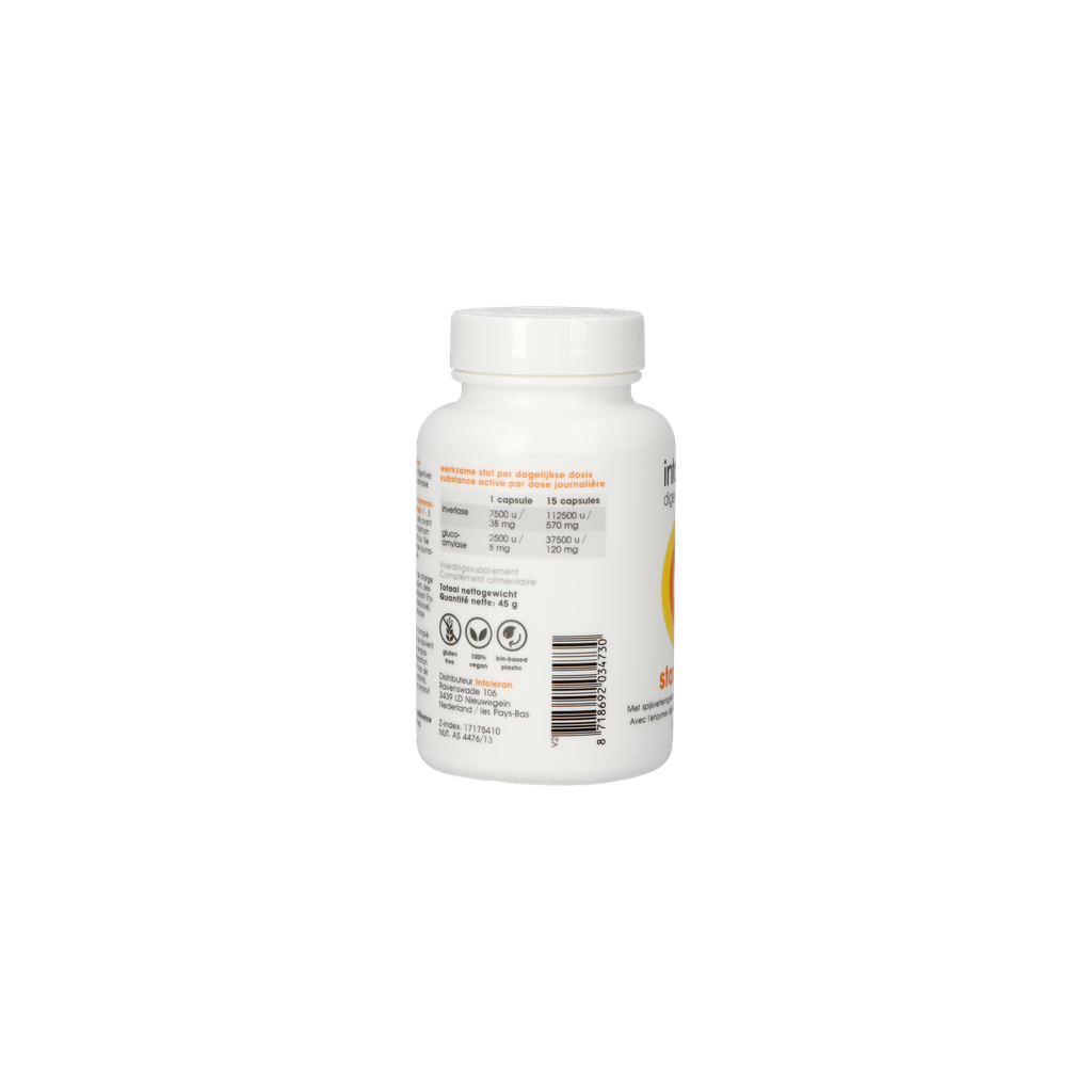 Ingrédients : Charge : carbonate de calcium, dextrose ; HPMC (gélule) ; Invertase (7500 u) ; Gluco-amylase (2500 u).