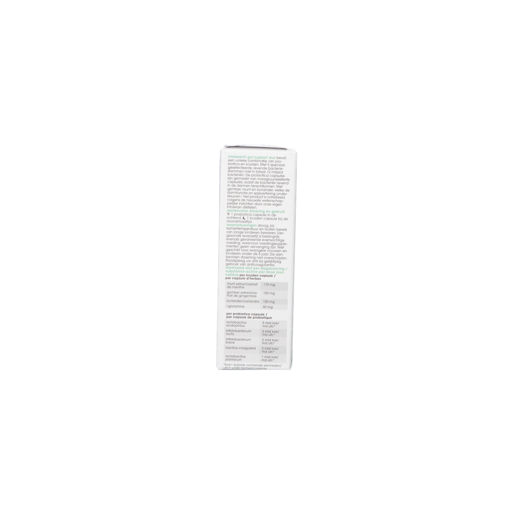 Intoleran Gut Support Duo est une combinaison de probiotiques et de plantes pour soutenir la fonction intestinale et la digestion. Le produit a été développé par nos diététiciens Intoleran sur la base des dernières connaissances scientifiques. Gut Support Duo se compose de deux types de gélules : des gélules de probiotiques pour le matin et des gélules de plantes médicinales pour soutenir le fonctionnement de l'intestin et la digestion pour le soir.