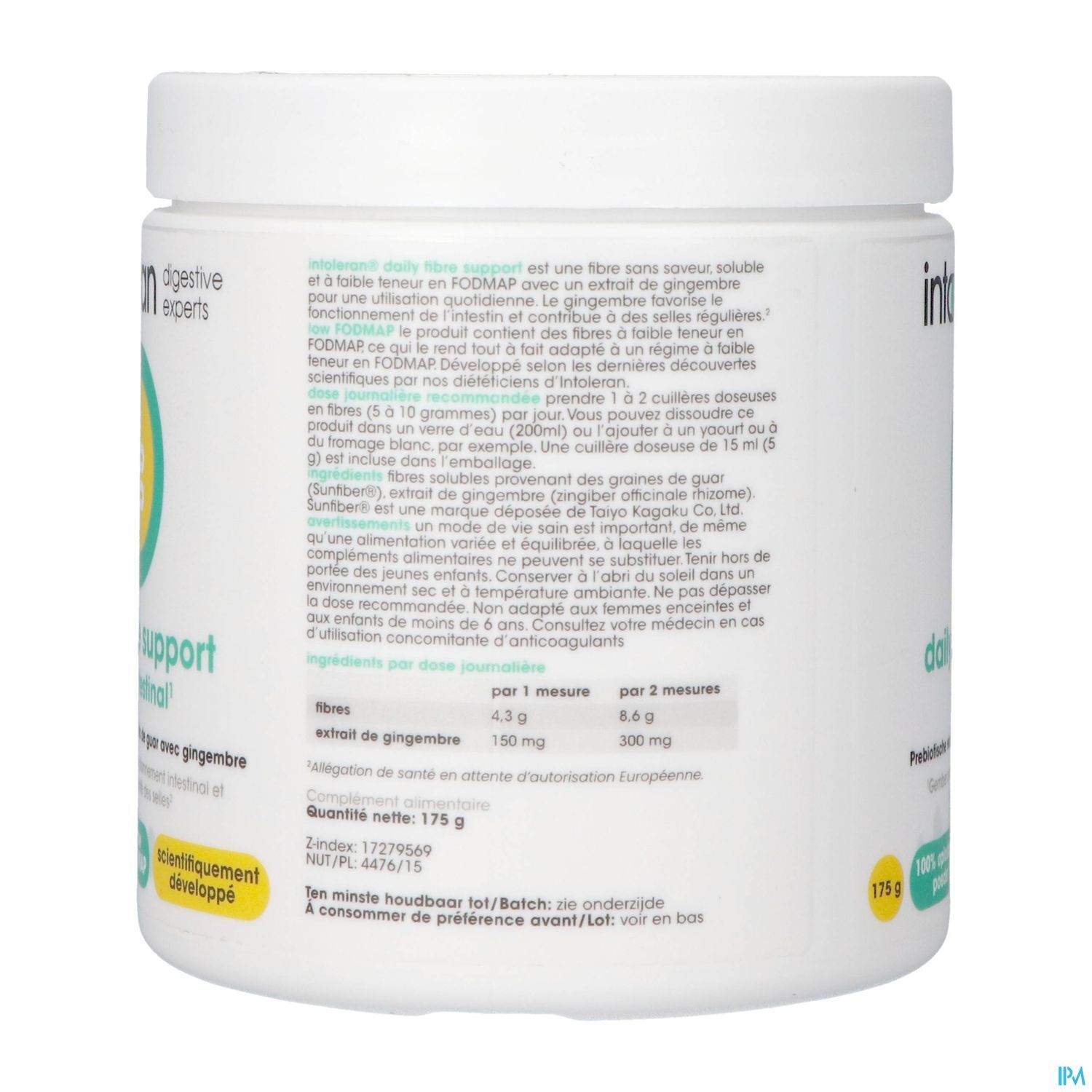 Intoleran Daily Fibre Support se compose de fibres prébiotiques issues de la fève de guar et d'un extrait de gingembre. Le produit sert à compléter l'apport quotidien en fibres et favorise le fonctionnement de l'intestin et la régularité des selles. Intoleran Daily Fibre Support a été développé par nos diététiciens internes sur la base des dernières découvertes scientifiques et est considéré comme le complément idéal en fibres. La fibre de guar est également connue sous le nom de PHGG (Partially Hydrolized Guar Gum) et SunFiber®. Le soutien quotidien en fibres d'Intoleran est insipide et 100 % soluble dans votre nourriture et vos boissons. soluble à 100 % dans vos aliments et boissons. Contrairement à d'autres fibres qui donnent une structure gélatineuse aux aliments, la fibre de guar n'affecte ni le goût ni la texture. Vous pouvez donc facilement l'ajouter à l'eau, au yaourt, au jus, au fromage blanc, à la soupe ou au smoothie, entre autres. Le soutien quotidien en fibres Intoleran est donc particulièrement facile à utiliser et vous permet de l'intégrer facilement dans votre routine quotidienne. Intoleran s'intègre facilement dans votre routine quotidienne.