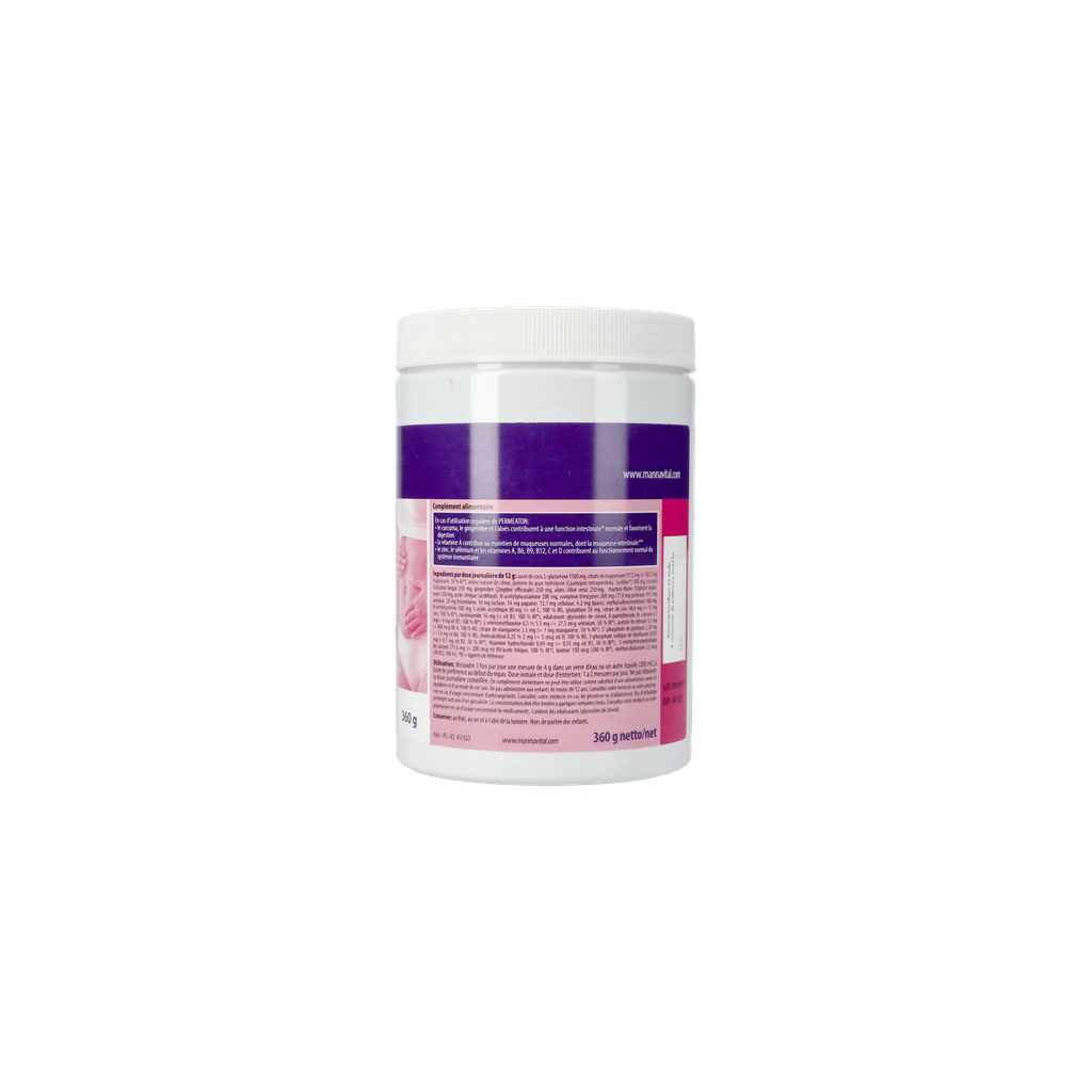 Ingrédients par dose journalière de 12 g : sucre de fleurs de coco, L-glutamine 1500 mg, citrate de magnésium 1172 mg (= 187,5 mg de magnésium, 50 % IR*), arôme naturel de citron, gomme de guar hydrolysée (Cyamopsis tetragonoloba, Sunfiber®) 500 mg, curcuma (Curcuma longa) 250 mg, gingembre (Zingiber officinale) 250 mg, aloès vrai (Aloe vera) 250 mg, chardon-marie (Silybum marianum) 250 mg, acide citrique (acide alimentaire), N-acétylglucosamine 200 mg, complexe enzymatique 200 mg (77,8 mg de protéase, 49,5 mg d'amylase, 28 mg de bromélaïne, 14 mg de lactase, 14 mg de papaïne, 12,7 mg de cellulase, 4,2 mg de lipase), méthylsulfonylméthane 100 mg, N-acétylcystéine 100 mg, acide L-ascorbique 80 mg (= vit C, 100 % RI*), glutathion 50 mg, citrate de zinc 48,4 mg (= 15 mg zinc, 150 % RI*), nicotinamide 16 mg (= vit B3, 100 % RI*), édulcorant : glycosides de stéviol, D-pantothénate de calcium 6,5 mg (= 6 mg vit B5, 100 % RI*), L-sélénométhionine 0,5 % 5,5 mg (= 27,5 mcg sélénium, 50 % RI*), acétate de rétinyle 5,3 mg (= 800 mcg vit A, 100 % RI), citrate de manganèse 3,3 mg (= 1 mg manganèse, 50 % RI*), pyridoxal-5'-phosphate 2,20 mg (= 1,4 mg vit B6, 100 % RI), cholécalciférol 0,25 % 2 mg (= 5 mcg vit D, 100 % RI), riboflavine-5-phosphate de sodium 0,925 mg (= 0,7 mg vit B2, 50 % RI*), chlorhydrate de thiamine 0,69 mg (= 0,55 mg vit B1, 50 % RI*), Calcium 5-méthyltétrahydrofolate 271,6 mg (= 200 mcg vit B9/acide folique, 100 % RI*), biotine 150 mcg (300 % RI*), méthylcobalamine 2,5 mcg (Vit B12, 100 %).
