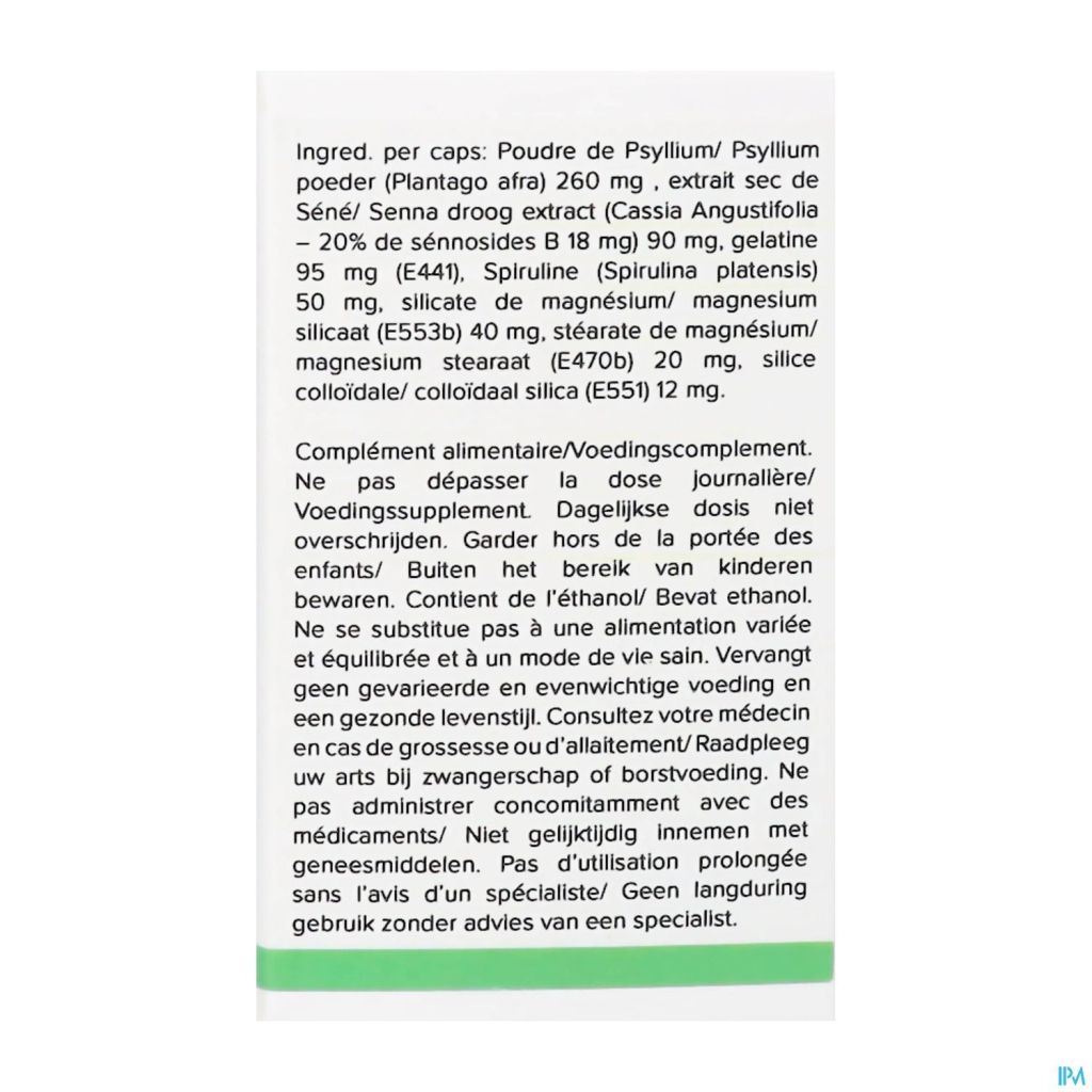 Poudre de psyllium (Plantago afra) 260 mg, extrait sec de séné (Cassia Angustifolia - 20% de sénnosides B 18 mg) 90 mg, gélatine 95 mg (E441), spiruline (Spirulina platensis) 50 mg, silicate de magnésium (E553b) 40 mg, stéarate de magnésium (E470b) 20 mg, silice colloïdale (E551) 12 mg.