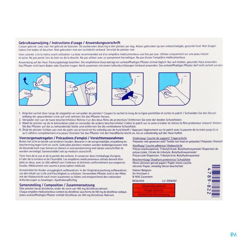 La substance active de ce médicament est le diclofénac sodique. Chaque patch contient 140 mg de diclofénac sodique. Les autres substances contenues dans ce médicament sont:-Couche de support : tissu non tissé en polyester-Couche adhésive : copolymère de méthacrylate butylé basique, copolymère d'acrylate d'acétate de vinyle, stéarate de PEG-12, sorbitanoléate-Dossier : papier enduit de monosilicone