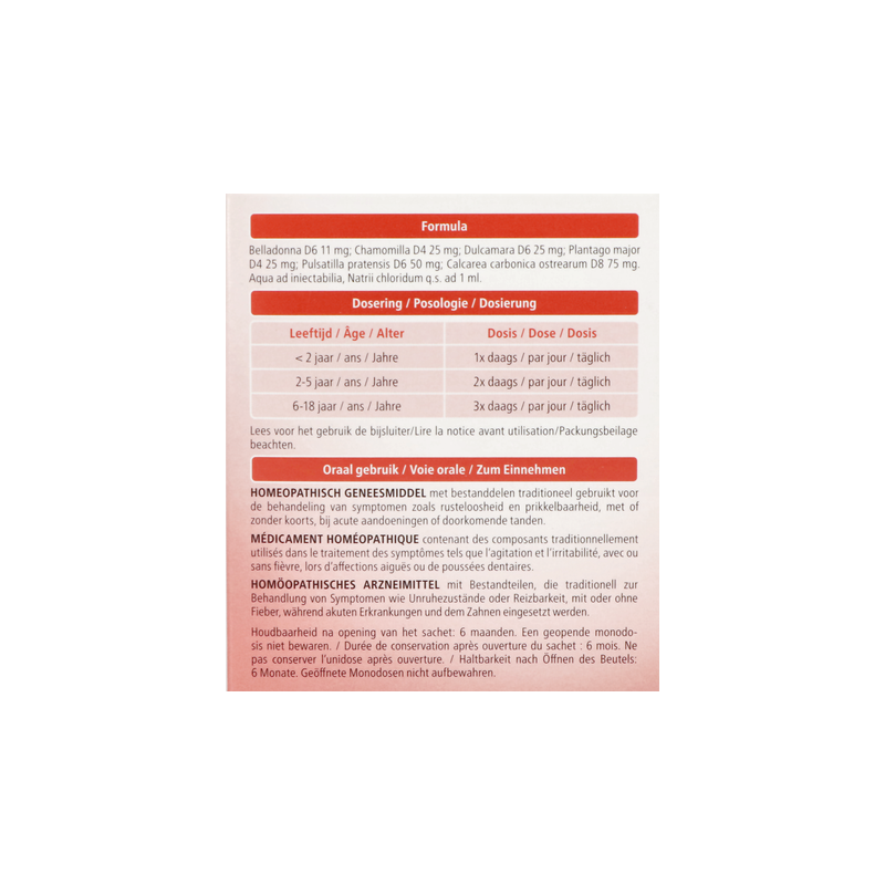 Belladonna D6; Chamomilla D4; Dulcamara D6; Plantago major D4; Pulsatilla pratensis D6; Calcarea carbonica ostrearum D8. Excipients : Aqua ad iniectabilia, Natrii chloridum.