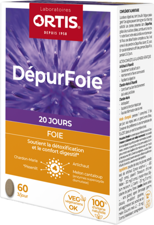 Ortis Depur Foie est un complément alimentaire à base d'artichaut, de pissenlit et de chardon-marie qui aident à détoxifier et soutenir les fonctions hépatodigestives.