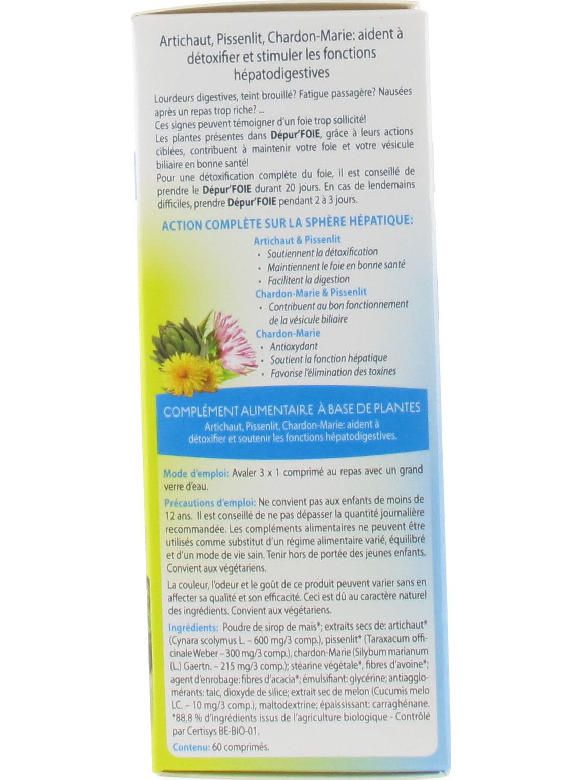 Poudre de sirop de maïs*; extraits secs de: artichaut* (Cynara scolymus L. – 600 mg/3 comp.), pissenlit* (Taraxacum officinale Weber – 300 mg/3 comp.), chardon-Marie (Silybum marianum (L.) Gaertn. – 215 mg/3 comp.); stéarine de palme*, fibres d'avoine*; agent d'enrobage: fibres d'acacia*; émulsifiant: glycérine; antiagglomérants: talc, dioxyde de silice; extrait sec de melon (Cucumis melo LC. – 10 mg/3 comp.), maltodextrine; épaississant: carraghénane. *88,8 % d'ingrédients issus de l'agriculture biologique - Contrôlé par Certisys BE-BIO-01.