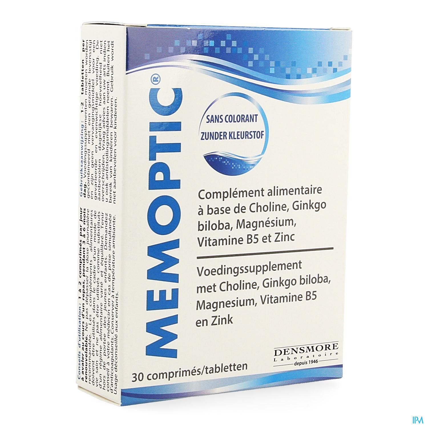 Memoptic est un complément alimentaire des laboratoires Deensmore qui associe l'extrait de Ginkgo Biloba, le zinc et la vitamine B5 afin de contribuer au maintien de la mémoire.