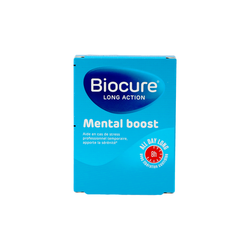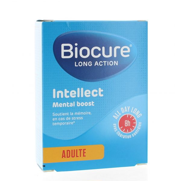 Biocure Intellect Long Action Mental Boost est un complément alimentaire qui soutient la mémoire et qui aide en cas de stress temporaire. Biocure Intellect Mental Boost contient des vitamines (B3 et B6), des minéraux (magnésium), de l'extrait de Rhadiole rose, de l'extrait d'Ashwagandha et de l'extrait d'aubépine.