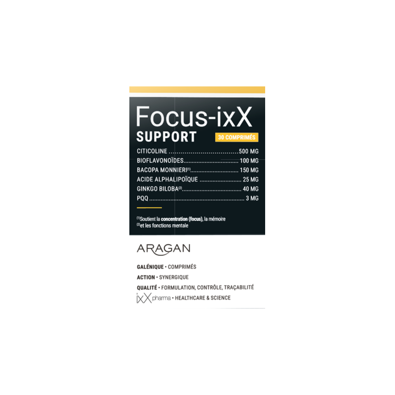 Focus-ixX®SUPPORT est une formule très innovante et efficace pour soutenir la concentration et la vitesse de réaction. Soutien cognitif idéal pour les adultes y compris pendant et après les inconforts hivernaux et aussi pour les personnes âgées. IxX pharma utilise pour la première fois le PQQ ou pyrroloquinoline quinone, une orthoquinone hétérocyclique aromatique.