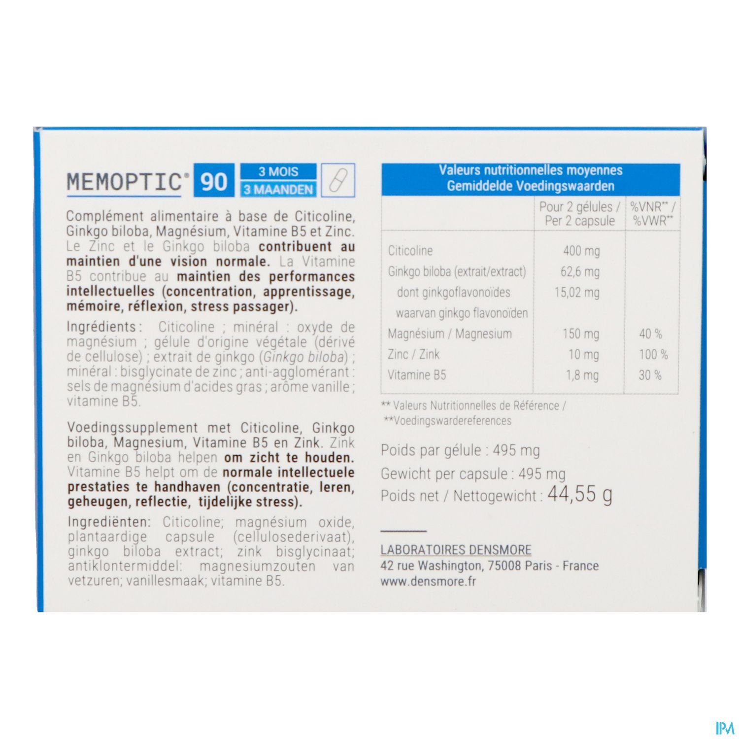 - Mémoptic est riche en magnésium (2 gélules apportent 80% de l'apport de référence) et en vitamine B5 (30% de l'IR).