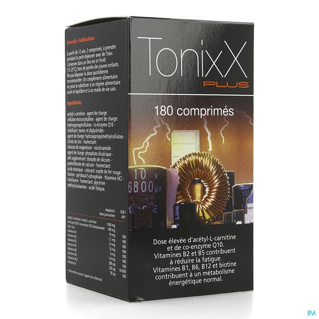 2 comprimés de TonixX PLUS contiennent 1500mg d'acétyl-L-carnitine, 100 mg de coenzyme Q10, 1,1 mg de vitamine B1 (100% AR), 1,4 mg de vitamine B2 (100% AR), 16 mg de vitamine B3 (100% AR), 6 mg de vitamine B5 (100% AR), 1,4 de mg vitamine B6 (100% AR), 2,5 µg de vitamine B12 (100% AR), 200 µg d'acide folique (100% AR), 50 µg de biotine (100% AR) et 10 mg du zinc (100% AR, sous forme de bisglycinate, une forme moderne bien assimilable).