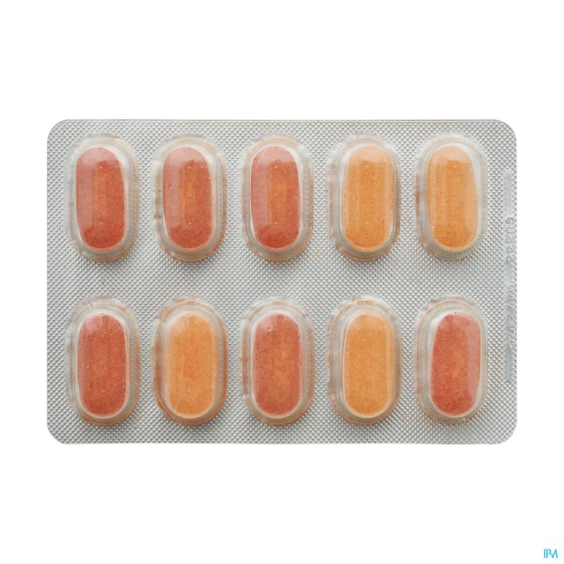 Agents de charge: cellulose microcristalline, carbonate de calcium; oxyde de magnésium (14 %); extrait de guarana/(Paullinia cupana) (8,5 %); stabilisateur: hydroxypropylméthylcellulose; diphosphate de fer (3,2 %), extrait de ginseng (Panax ginseng) (2,8 %), anti-agglomérants: sels de magnésium d'acides gras, carboxyméthylcellulose de sodium réticulé, dioxyde de silice, nicotinamide (1,1 %), colorant: oxyde de fer (rouge), oxyde de fer (jaune); acide pantothénique (0,5 %), mononitrate de thiamine (0,3 %), cyanocobalamine (0,2%), hydrochlorure de pyridoxine (0,1 %), riboflavine (0,1 %), acide folique (0,01 %), biotine (0,003 %).