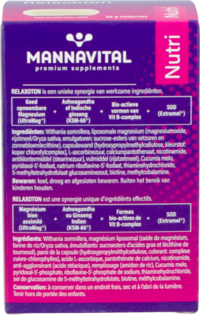 RELAXOTON est une formule totale naturelle qui aide à rester calme et concentré dans les modes de vie occidentaux occupés, tout en améliorant les performances. Pour ce faire,RELAXOTON contient principalement la combinaison relaxante de magnésium facilement absorbable et le complexe total de vitamines B sous leurs formes bioactives. Pour un effet optimal, ce duo a été complété par la plante " adaptogène " Ashwagandha (ginseng indien), qui augmente notre capacité d'adaptation dans des conditions défavorables et occupées, nous permettant de rester calmes et concentrés et de ressentir moins de fatigue. RELAXOTON contient également un extrait de melon, source de superoxyde dismutase (SOD), l'antioxydant principal.